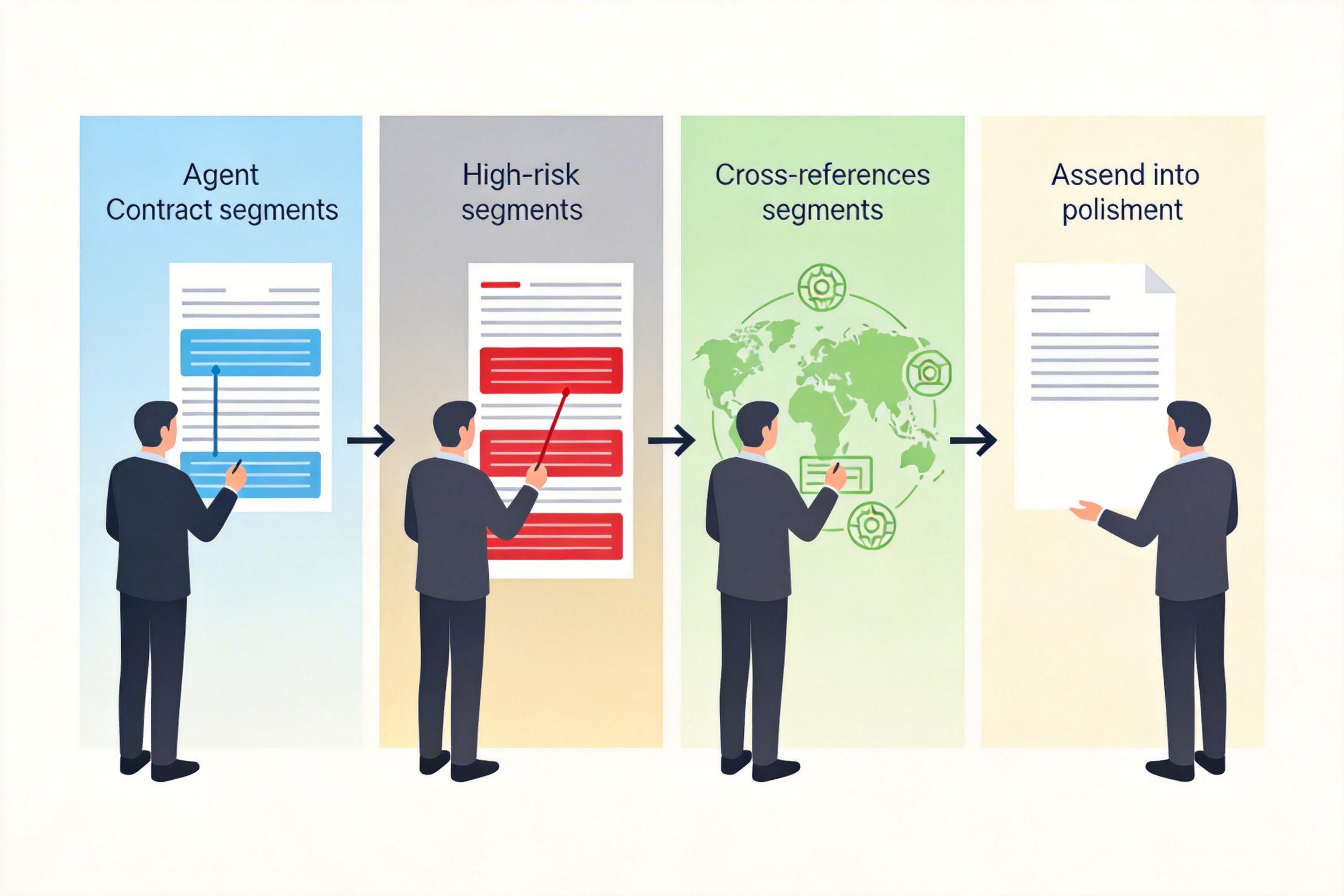 比如一份跨国并购合同,条款提取Agent先把所有关键条款扒出来,风险评分Agent给每条条款标红风险等级,合规审查Agent对照60多个国家的法规查漏洞,最后由起草Agent把这些内容整合成符合律所风格的初稿。整个过程像工厂组装零件,每个环节都精准可控。
