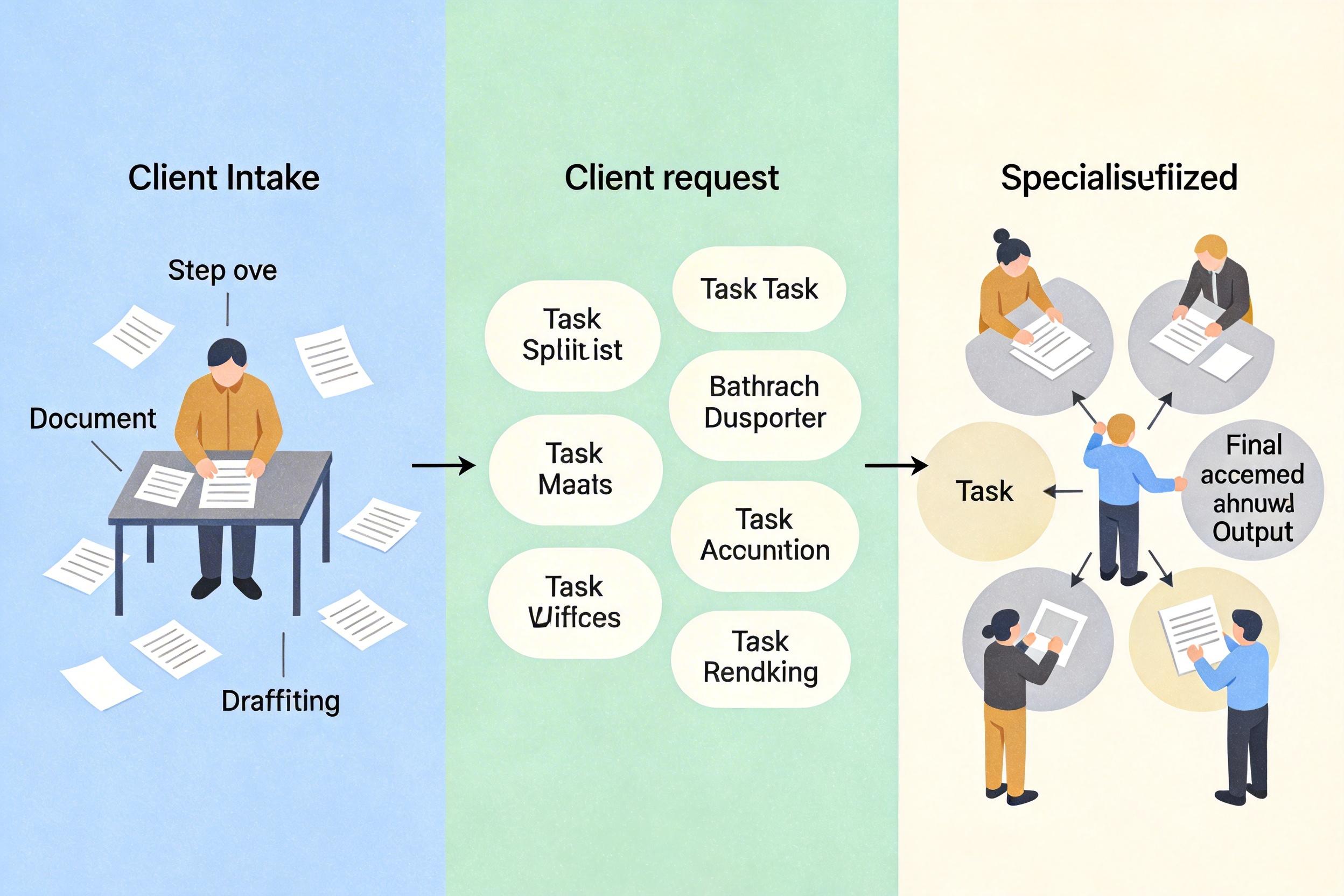 传统律所的工作是「一条龙」:一个律师从接案子到写文书全包,大部分时间耗在翻文件、找法条这种杂活上。Harvey把这个流程拆成了「流水线」:客户需求先被拆解成十几个专项任务,每个任务交给对应的Agent处理,最后再由一个统筹Agent把结果拼成完整的交付物。