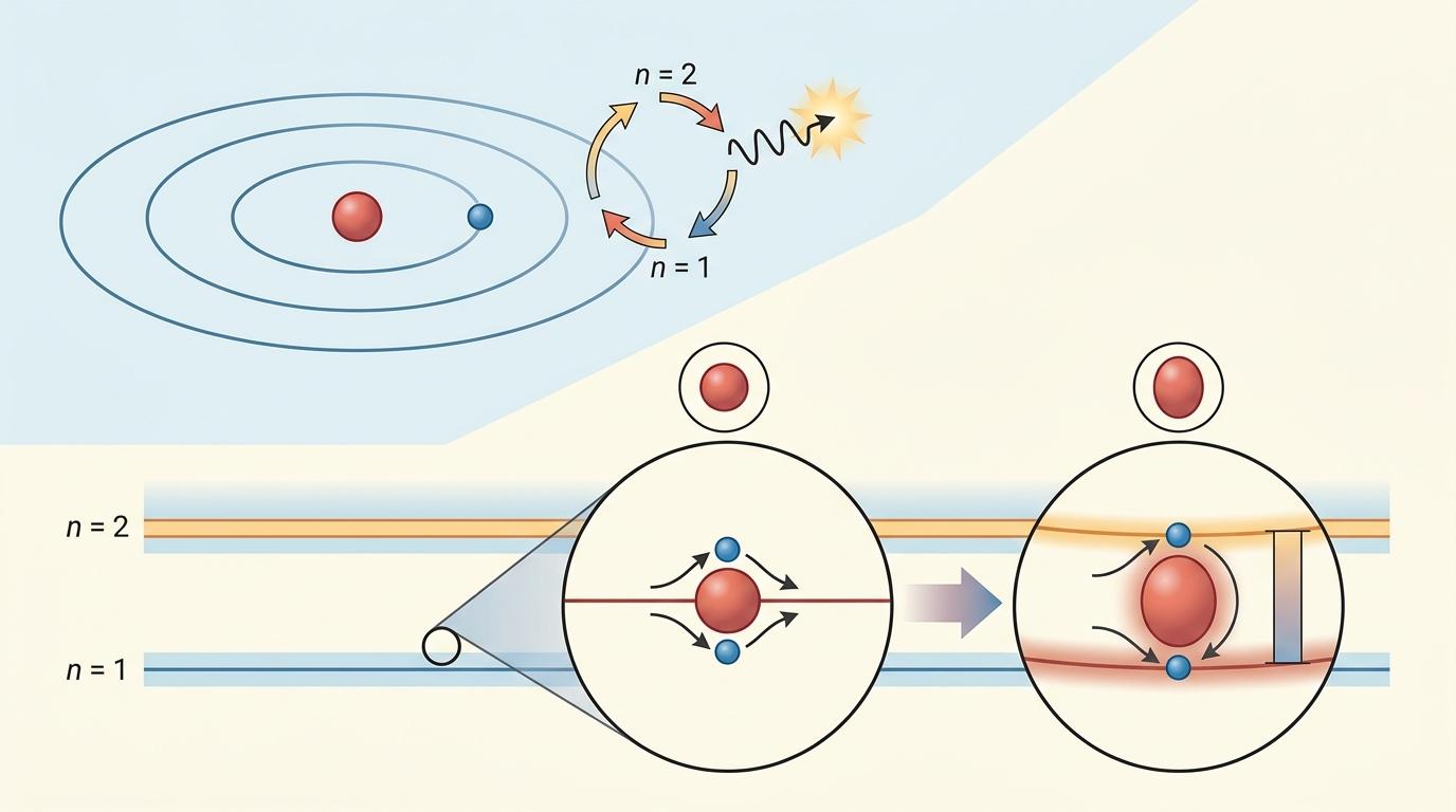 氢原子是宇宙中最简单的原子:一个质子加一个电子。电子像绕着太阳转的行星,只能待在固定的“轨道能级”上。当它从一个能级跳到另一个,会吸收或发射特定频率的光子,这个频率就像电子的“指纹”。而质子不是完美的点粒子,它有自己的大小,会轻微改变电子的能级——质子越大,电子在质子内部“逗留”的概率越高,能级偏移就越明显。