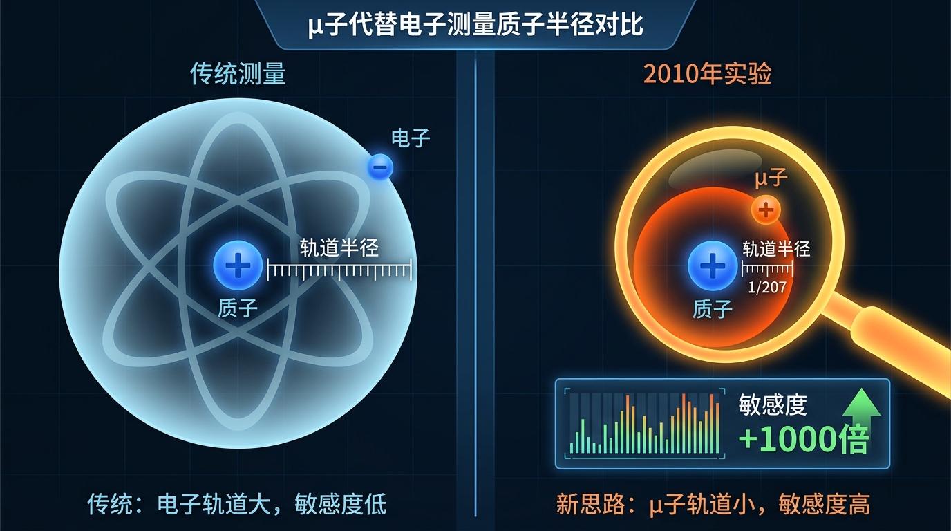 传统测量用的是普通氢原子,但电子轨道离质子太远,能级偏移小到几乎测不出来。2010年的实验换了个思路:用μ子代替电子。μ子质量是电子的207倍,轨道半径直接缩小到原来的1/207,相当于把“尺子”直接怼到了质子脸上,对质子大小的敏感度瞬间提升了1000倍。
