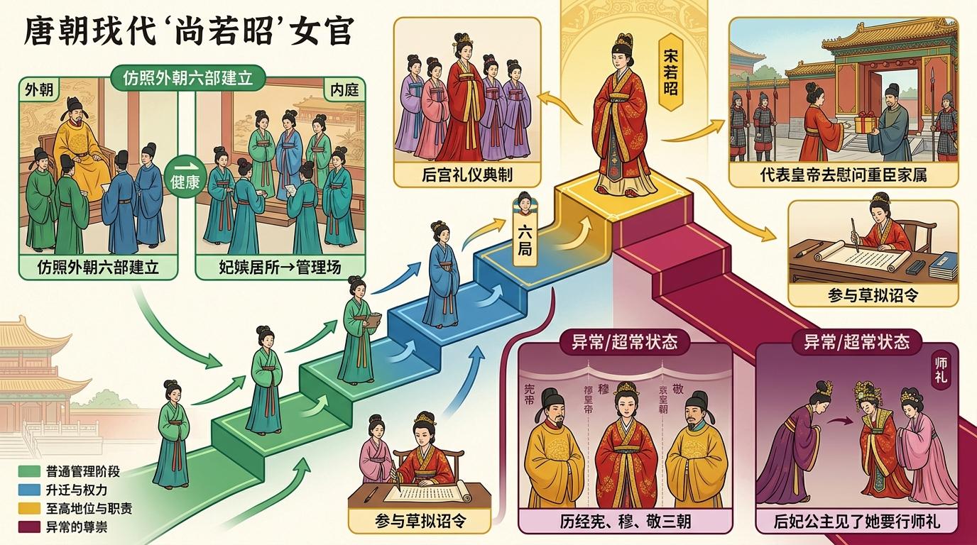 她们的仕途,踩着唐代尚宫制度的阶梯一步步往上。这套仿照外朝六部建立的宫廷女官体系,把后宫从单纯的妃嫔居所,变成了有职有权的管理场。宋若昭后来坐上的尚宫之位,是六局之首的“女尚书”:她要管后宫的礼仪典制,要代表皇帝去慰问重臣家属,甚至要参与草拟诏令。更惊人的是,她历经宪、穆、敬三朝,被皇室上下以“先生”相称,后妃公主见了她要行师礼,这份尊崇,早已超越了普通女官的边界。
