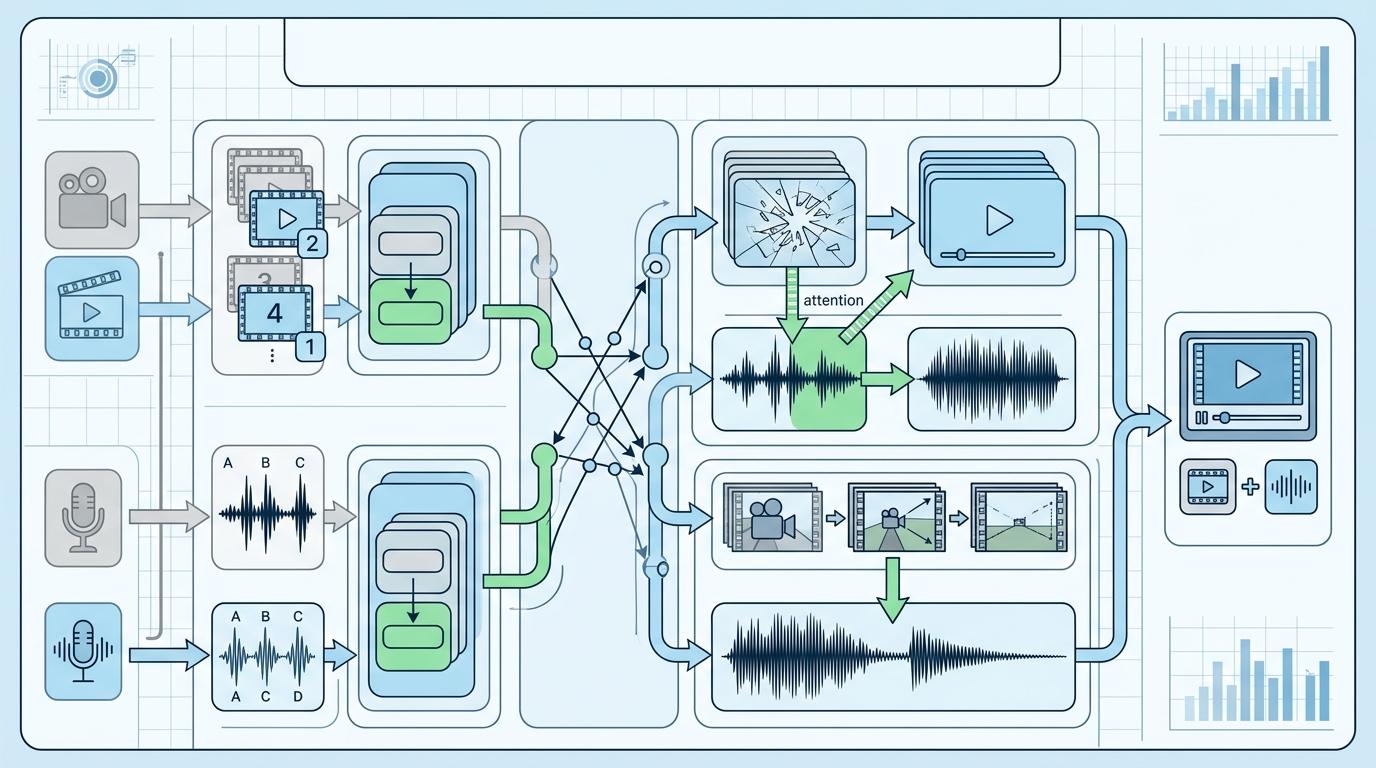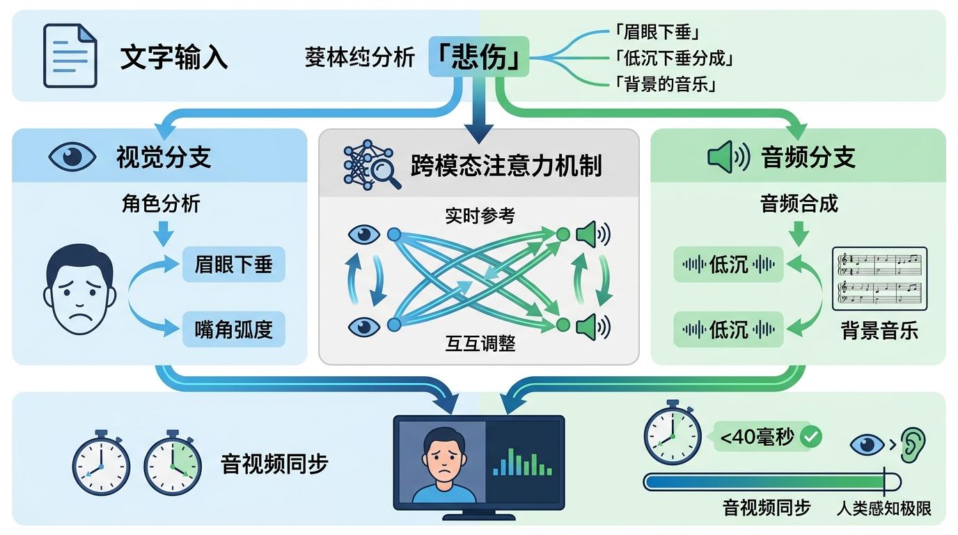 但真实的机制比这更精确。这套系统的核心是跨模态注意力机制:文本描述里的「悲伤」,会引导视觉分支重点捕捉人物的眉眼下垂、嘴角弧度,同时让音频分支生成低沉的背景音乐。每一个模态的输出,都在实时参考其他模态的信号,最终实现误差低于40毫秒的音视频同步——这个精度,已经接近人类肉眼的感知极限。