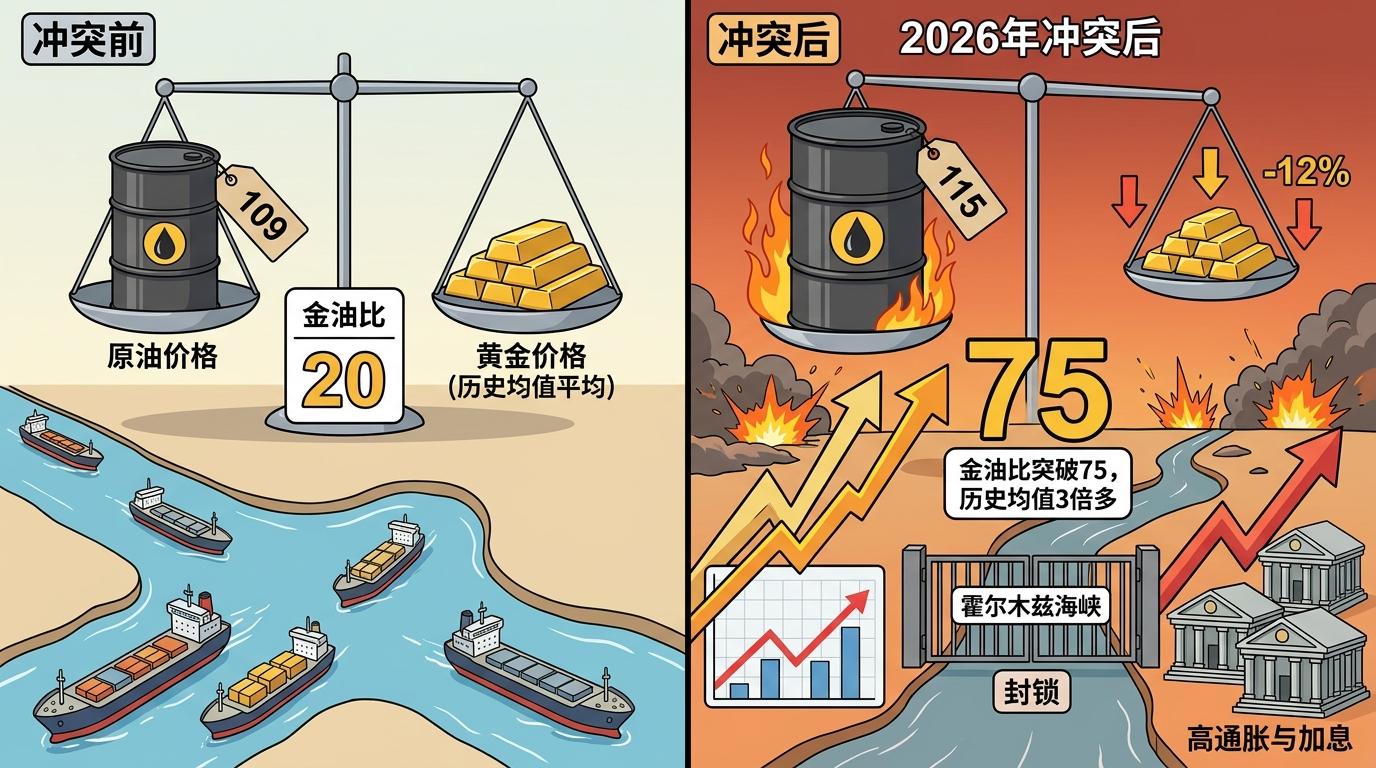 但2026年的中东冲突,直接把这天平掰成了麻花。霍尔木兹海峡被封锁后,油价一口气冲到115美元/桶以上,而黄金却因为通胀升温引发的加息预期,反倒跌了12%。此时的金油比直接突破了75,是历史均值的3倍多——相当于用过去能买20桶油的黄金,现在能买75桶。