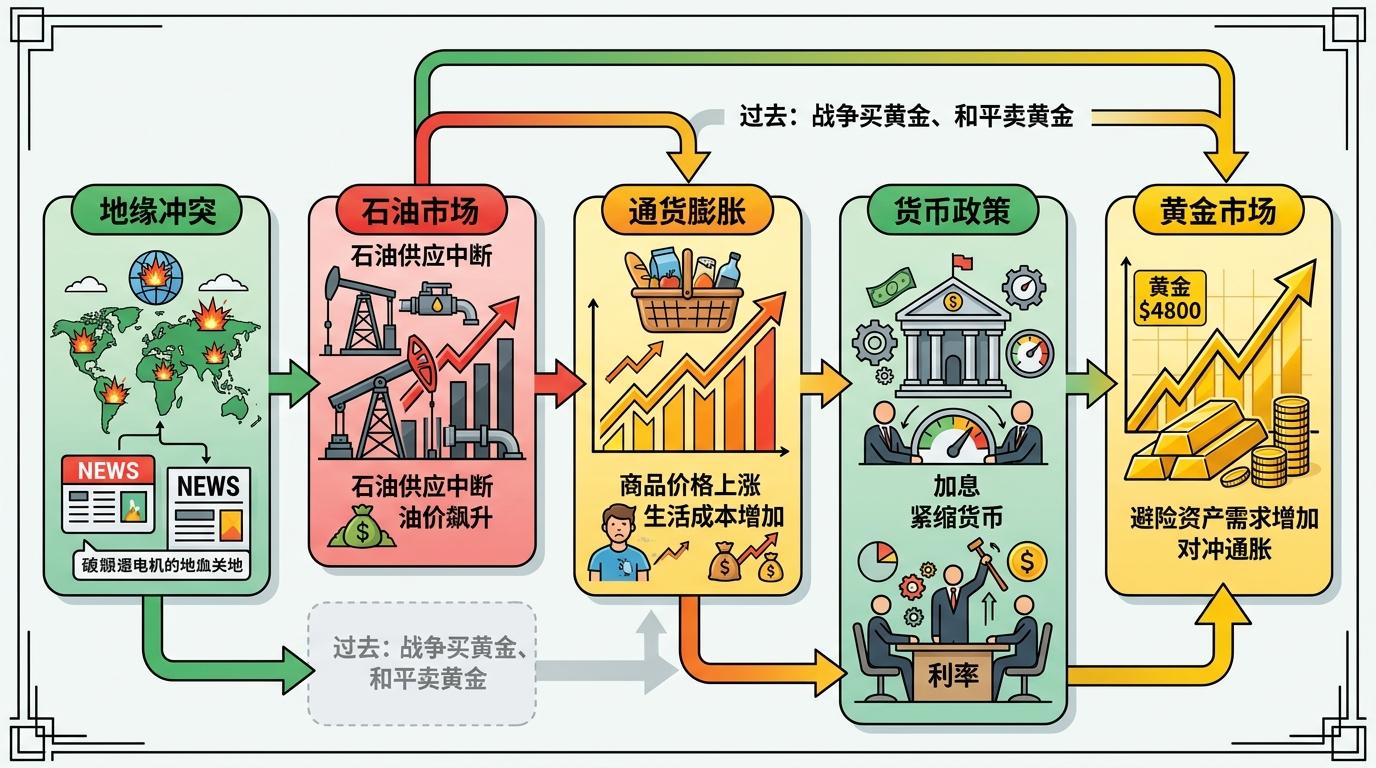 当黄金冲破4800美元的那一刻,我们看到的不只是金价的暴涨,更是地缘冲突对全球大宗商品市场的深度重塑。过去那种“战争买黄金、和平卖黄金”的简单逻辑,已经被“油价-通胀-货币政策-黄金”的复杂链条取代。