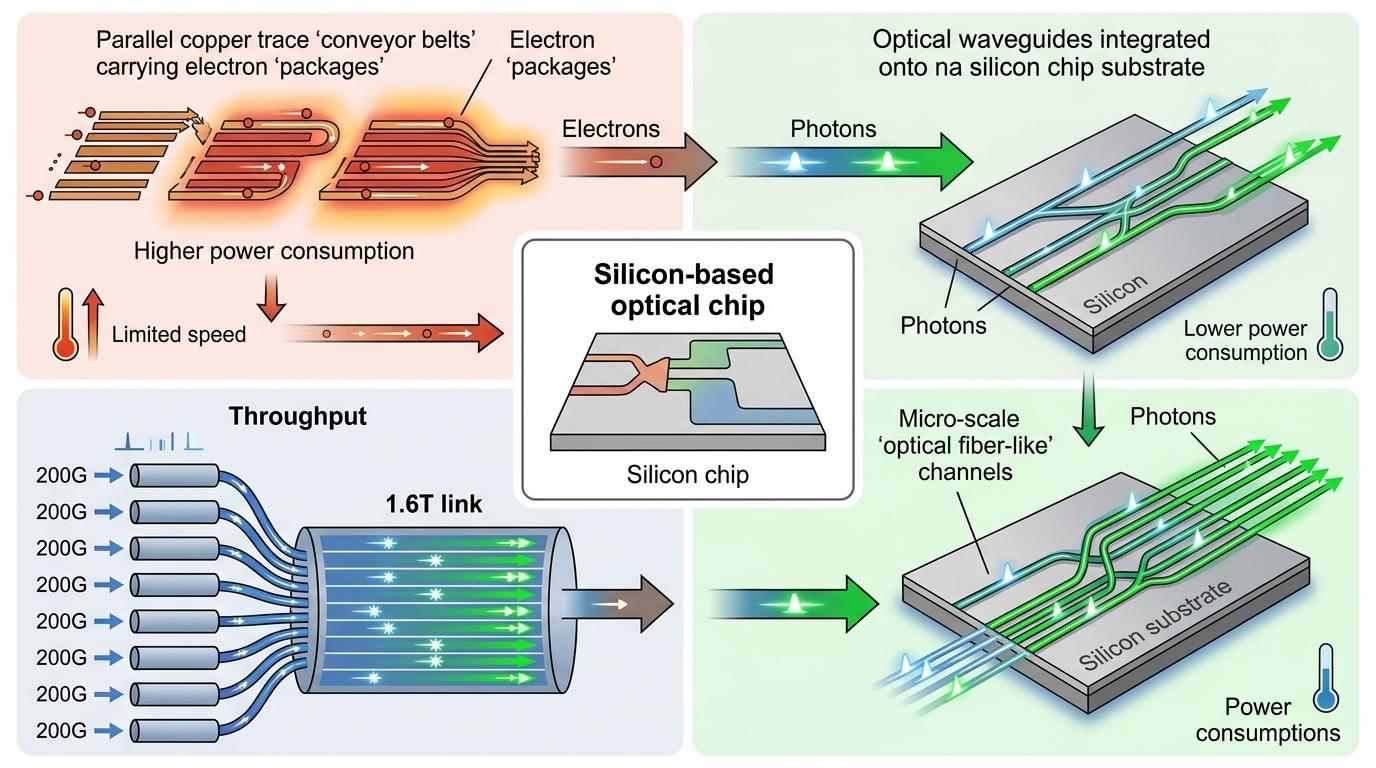 你可以把AI数据中心想象成一座超级工厂,GPU是车间里的工人,而数据传输链路就是连接各个车间的传送带。以前用铜线当传送带,不仅跑不快,还得不停给传送带降温——铜线传输数据时,电子会在金属里「撞墙」,一半能量都变成了热量。