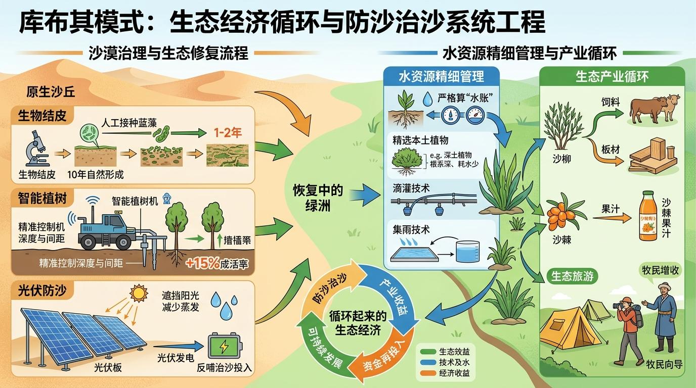更值得关注的是,库布其的治沙早已跳出“只防不养”的旧模式。科研人员把自然需要十年才能形成的生物结皮,用人工接种蓝藻的方法缩短到1到2年;智能植树机能精准控制种苗深度和间距,让成活率提升15%以上;光伏板在沙漠里架起蓝色屏障,既挡住直射的阳光减少蒸发,又能发电反哺治沙投入。这里的每一片绿都算过“水账”:选的都是根系深、耗水少的本土植物,用滴灌和集雨技术把每一滴水用到极致;每一项治理措施都连着“生计”,沙柳可以做饲料和板材,沙棘能榨果汁,生态旅游让牧民变成了向导——治沙不再是单纯的投入,而是能循环起来的生态经济。