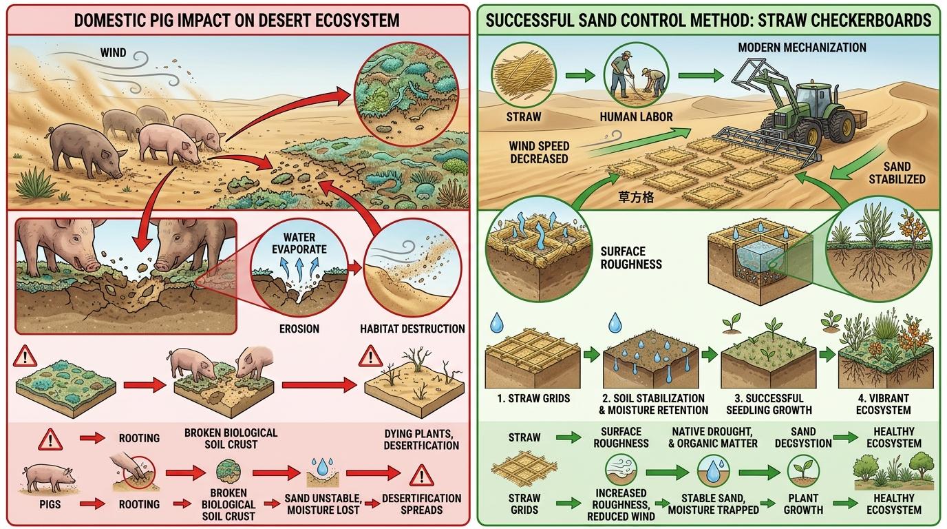 中国林科院荒漠化研究所的专家早已给出明确判断:家猪不耐旱热,要消耗大量饲料与水源,更致命的是,它拱动沙土的天性会直接破坏生物结皮——那层由蓝藻、苔藓和微生物织成的“沙漠皮肤”,是花了数年甚至十数年才在沙面形成的脆弱屏障,能固定沙粒、留住水分,是植被存活的前提。库布其的治沙起点,从来不是异想天开的动物,而是1950年代就开始用的草方格:把稻草扎成1米见方的网格,铺在流动沙丘上,瞬间把地表粗糙度提升数倍,让风速降下来,让沙粒沉下来,为沙柳、沙棘这些本土耐旱植物挣得扎根的机会。如今这项技术已经实现机械化,一台设备一天能铺出过去百人才能完成的草方格,但核心逻辑从未变过:先稳住沙,再种活树。
