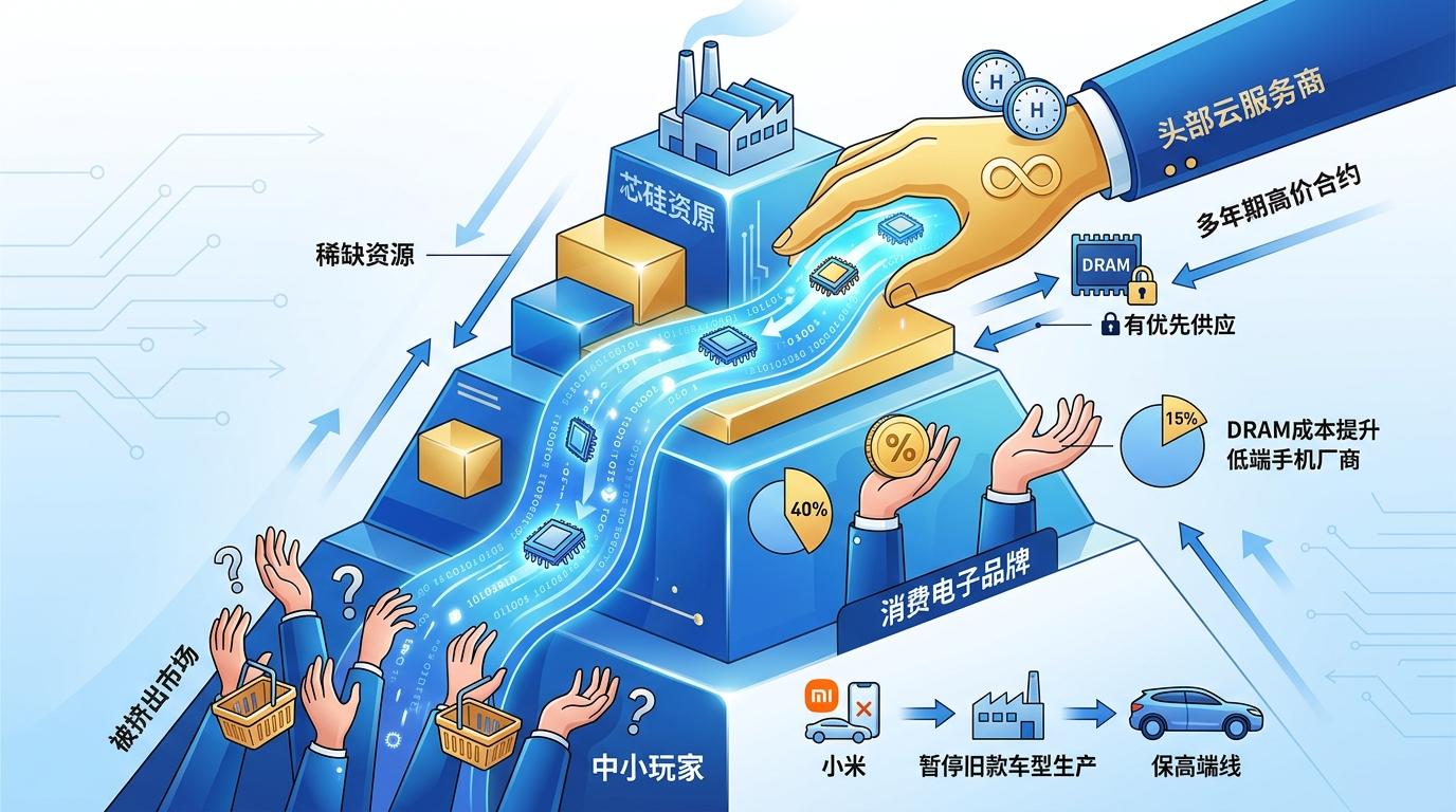 这不是普通的涨价,是产业链分层的开始。头部云服务商靠着多年期高价合约锁定了优先供货权,甚至能以“小时级”的动态价格拿到稀缺资源;而中小厂商和消费电子品牌只能在剩下的份额里竞价,部分低端手机厂商的DRAM成本占比已从15%跃升至40%,连小米都不得不暂停旧款车型生产,集中资源保高端线。这种“金字塔式”的供应结构,正在把中小玩家挤出市场。