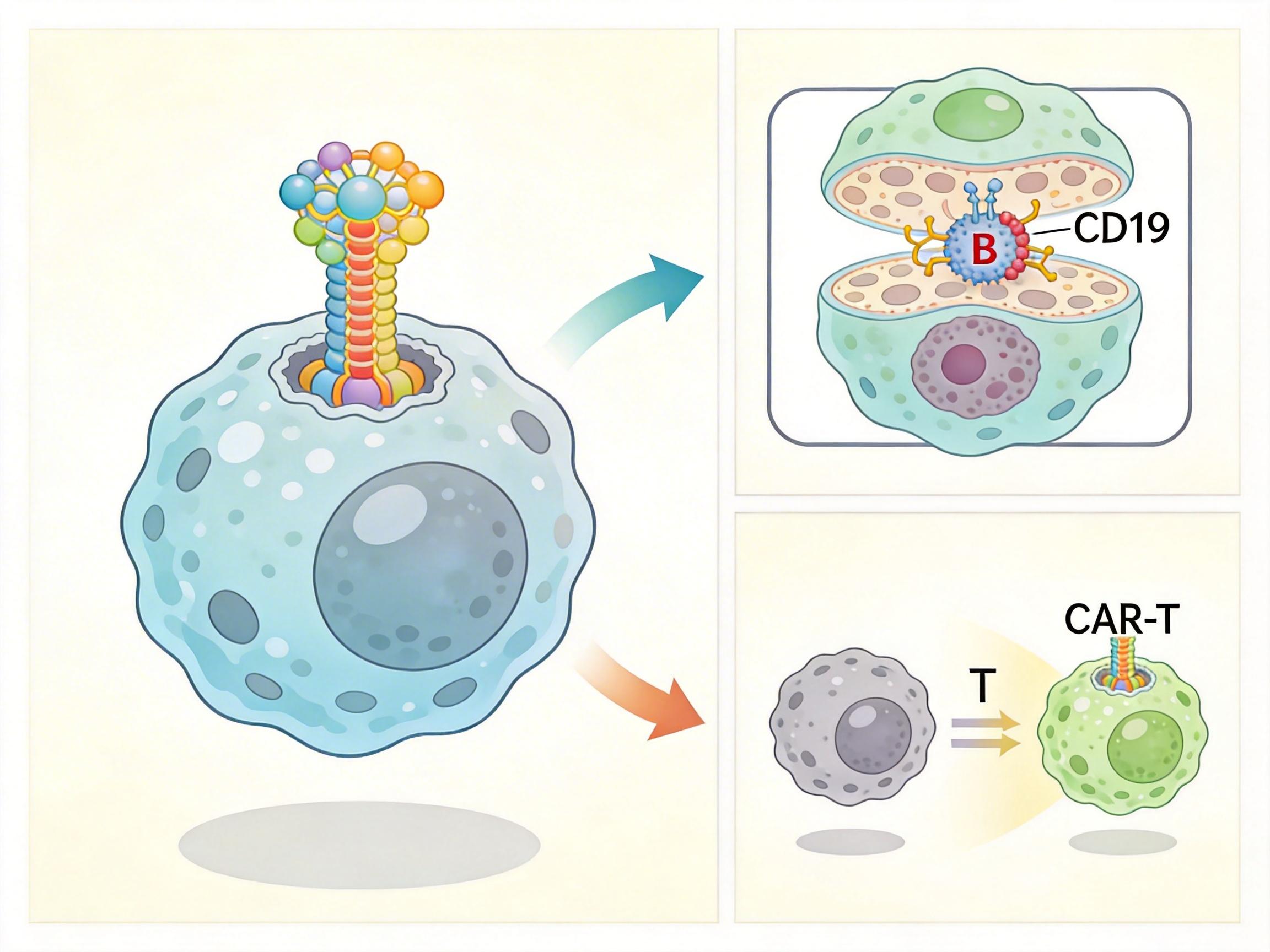 CAR T细胞疗法的思路完全不同:它从患者体内提取普通T细胞,在实验室里给它们装上“精准导航”——嵌合抗原受体(CAR),让T细胞能精准识别异常B细胞表面的CD19抗原。这些改造后的“超级士兵”回输到体内后,会像追踪导弹一样清除所有表达CD19的B细胞,包括制造自身抗体的浆母细胞。