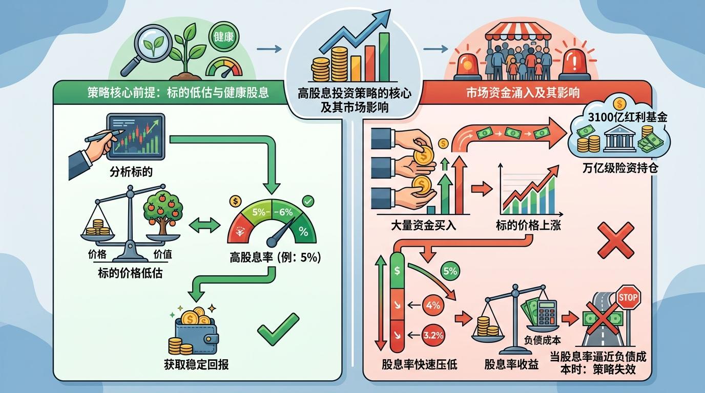 高股息策略的核心前提是“标的被低估”,但当3100亿红利基金加上万亿级的险资直接持仓共同买入时,标的价格被迅速推高,股息率被快速压低。原本5%的股息率,股价涨20%后就变成了4%,再涨20%就只剩3.2%——当股息率逼近负债成本时,这个策略就失去了意义。