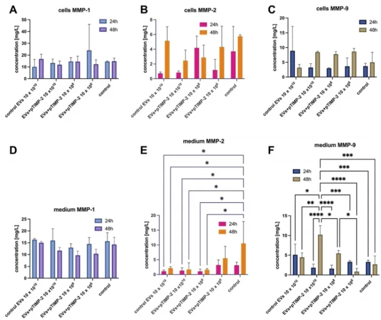 当装着TIMP-2基因的EVs被送回肺癌细胞培养体系后,神奇的事情发生了:48小时后,培养液里的MMP-2活性显著下降,而且EVs浓度越高,抑制效果越明显——这说明TIMP-2基因成功在肺癌细胞里「安家落户」,开始生产刹车蛋白。