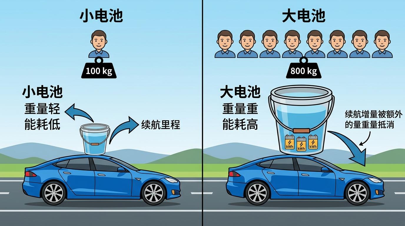 你可以把电池想象成汽车背着的水桶——桶越大装的水越多,但背起来也越费力。一块100kWh的磷酸铁锂电池重量超过600公斤,相当于多坐了8个成年人。车重每增加100公斤,高速行驶时的能耗会上升5%-8%,这意味着大电池带来的续航增量,很大一部分被额外的重量吃掉了。