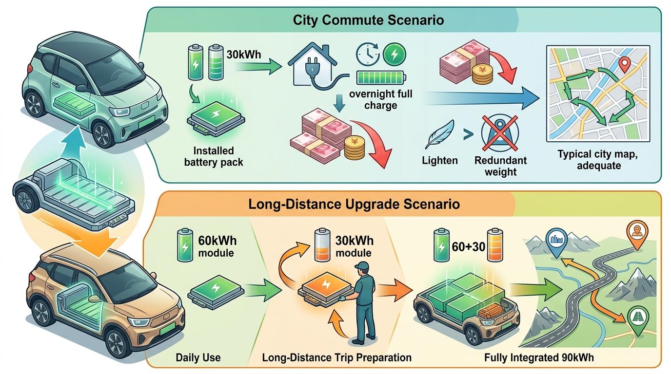 比如针对城市通勤用户,推出30kWh的小电池版本,车价能降3万,日常充电一晚上就能充满,完全够用;而针对长途需求多的用户,提供可升级的模块化电池包——平时用60kWh,跑长途时再加装一个30kWh的模块,不用常年背着冗余的重量。