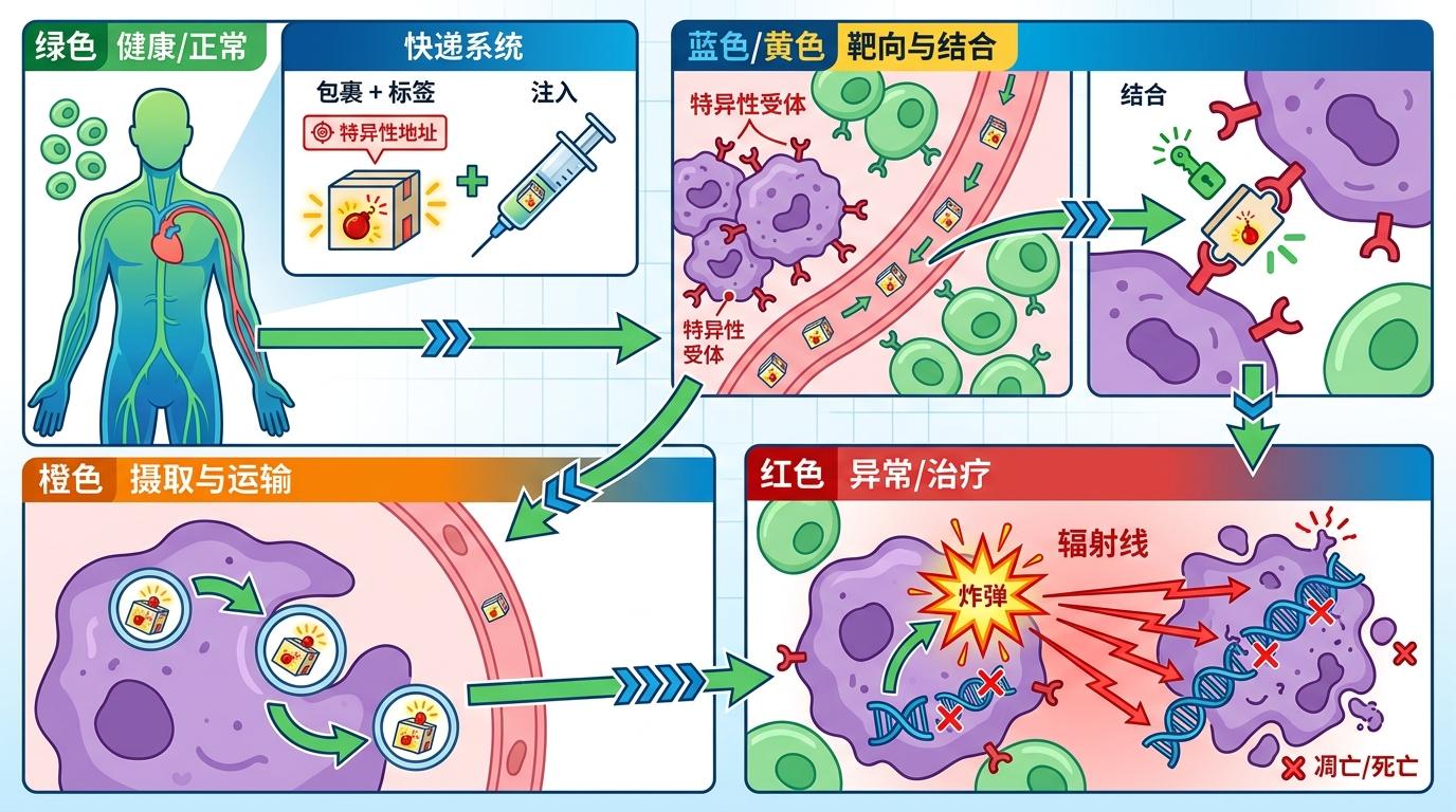 你可以把放射性配体疗法(Radioligand Therapy)想象成给癌细胞寄快递:配体是写着癌细胞专属地址的快递盒,放射性同位素是里面的炸弹,一旦快递被签收(配体结合癌细胞表面的特异性靶点),炸弹就会在癌细胞内部爆炸,释放的射线能直接打碎它的DNA。