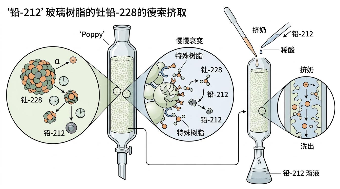 而英国团队“挤奶”的铅-212,另辟蹊径从核废料里的钍-228衰变而来:把核废料溶液注入“Poppy”玻璃柱,特殊树脂会抓住钍-228,等它慢慢衰变成铅-212,再用稀酸“洗”出来——就像从奶牛身上挤奶一样,每几天就能操作一次。