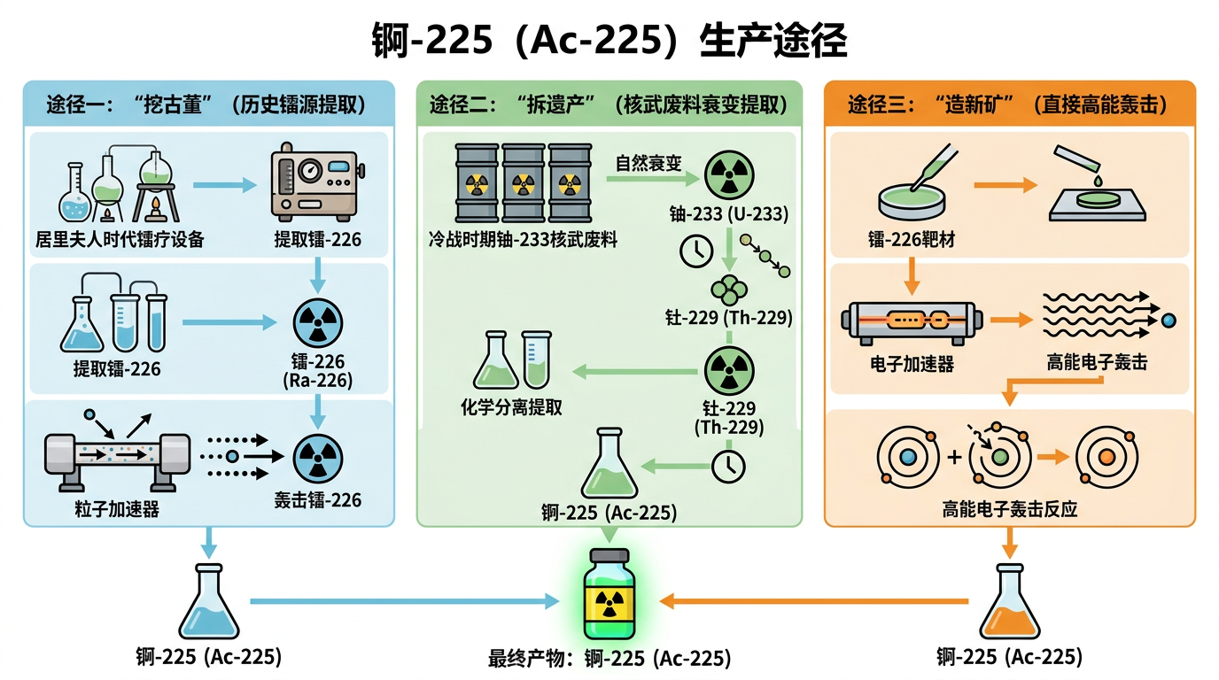 第一种是“挖古董”——从百年前居里夫人时代遗留的镭疗设备里提取镭-226,再用粒子加速器轰击产生锕-225;第二种是“拆遗产”——从冷战时期铀-233核武废料的衰变产物里提取钍-229,再等它自然衰变成锕-225;第三种是“造新矿”——用高能电子轰击镭-226靶材,通过核反应直接生成。