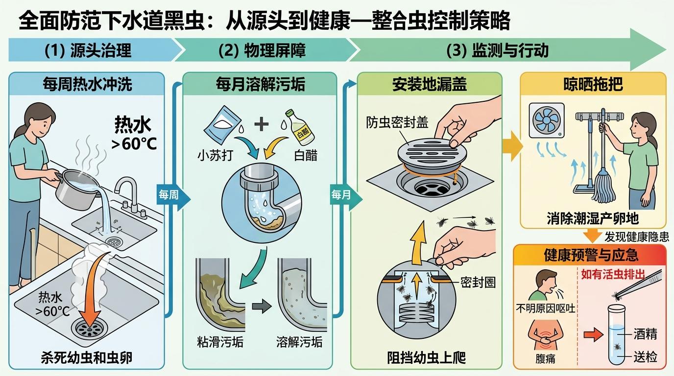 真正的防控从来不是拍死几只成虫,而是从源头切断它们的生存链。每周用60℃以上的热水冲洗下水管道,每月用小苏打加白醋溶解管壁的粘滑污垢;给地漏装上防虫密封盖,别让幼虫顺着缝隙爬上来;拧干的拖把要挂起来晾晒,别给它们留下潮湿的产卵地。如果家里出现不明原因的呕吐、腹痛,尤其是孩子排出活虫,记得用镊子把虫体泡在酒精里送检,别让这个下水道里的小黑虫,再成为家人的健康隐患。