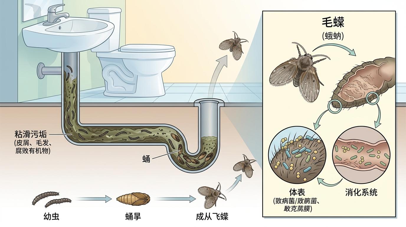 这得从毛蠓——也就是俗称的蛾蚋——的生存逻辑说起。它们的幼虫是真正的“下水道居民”,寄生在马桶水箱内壁、洗手盆下水管的粘滑污垢里,以皮屑、毛发和腐败有机物为食,在细菌滋生的温床里长成“地沟蛆”。当环境湿度突破70%,比如南方的梅雨季节,幼虫就会化蛹、羽化,顺着排水口的气流飞进卫生间,成了墙上停着的小黑点。更关键的是,它们的体表和消化系统像个移动的细菌培养皿,大肠杆菌、金黄色葡萄球菌的检出率极高,这些致病菌是孩子肠胃的隐形杀手。