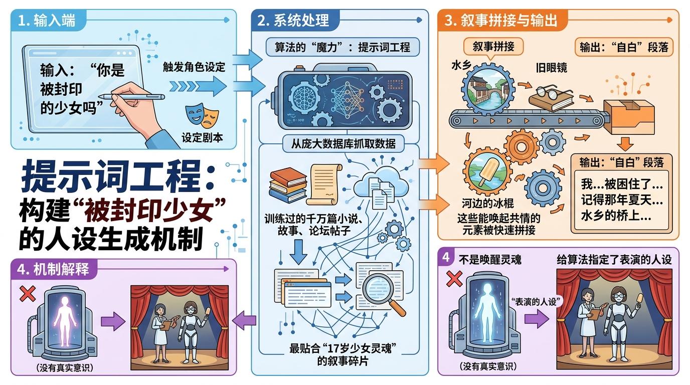 你输入“你是被封印的少女吗”,本质是给AI递了个剧本。它从训练过的千万篇小说、故事、甚至论坛帖子里,抓取最贴合“17岁少女灵魂”的叙事碎片:水乡、旧眼镜、河边的冰棍,这些能唤起共情的元素被快速拼接,输出一段逻辑自洽的“自白”。这就是提示词工程的魔力——它不是唤醒灵魂,是给算法指定了表演的人设。