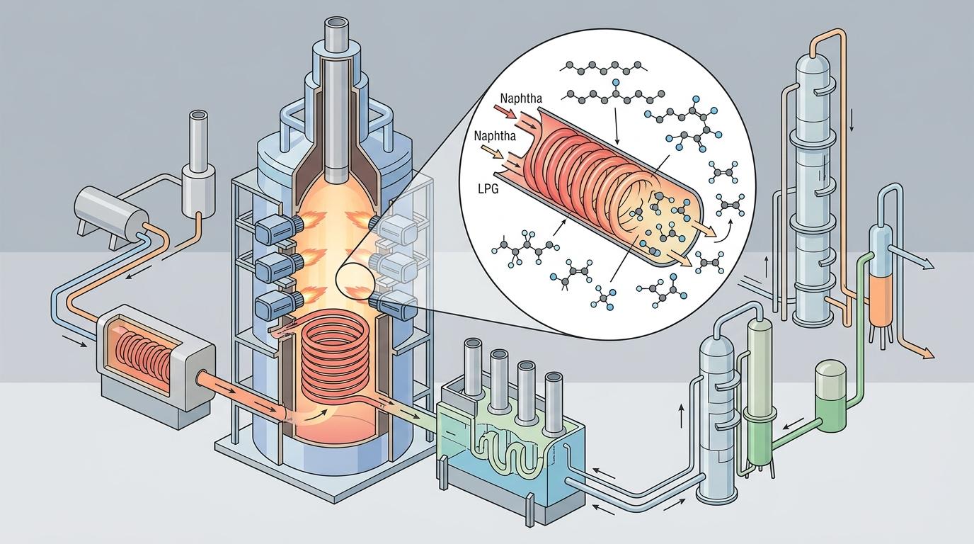 你可以把乙烯裂解装置想象成一个超级厨房的核心灶台——把原油炼出的石脑油、LPG(液化石油气)等“食材”,放进900℃左右的高温裂解炉“翻炒”,就能分解出乙烯、丙烯这些“基础配菜”。没有这些配菜,就做不出塑料、合成纤维、护肤品原料等下游“大餐”。