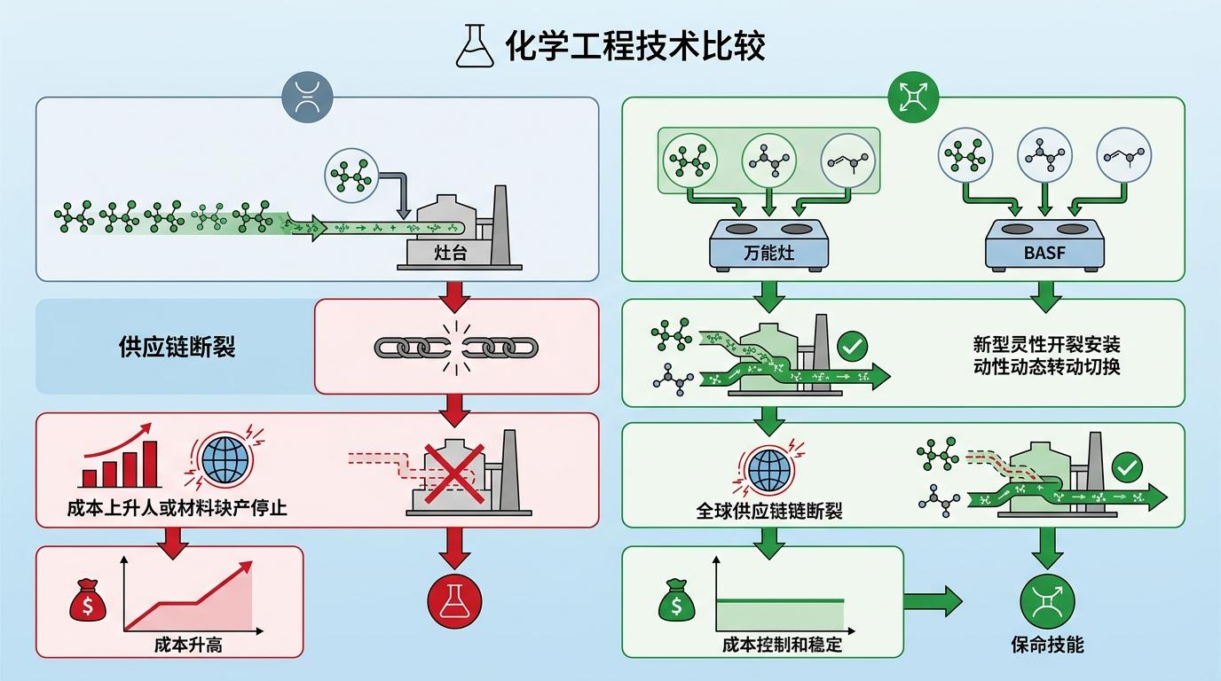 这个“灶台”的技术参数,直接决定了整个产业的成本和韧性。传统石脑油裂解炉就像只能做中餐的灶台,原料单一;而巴斯夫湛江基地的装置,是能切换石脑油、丁烷等多种原料的“万能灶”——当一种原料涨价或断供,立刻就能换另一种,这在中东战事导致原料供应链断裂的当下,简直是“保命技能”。