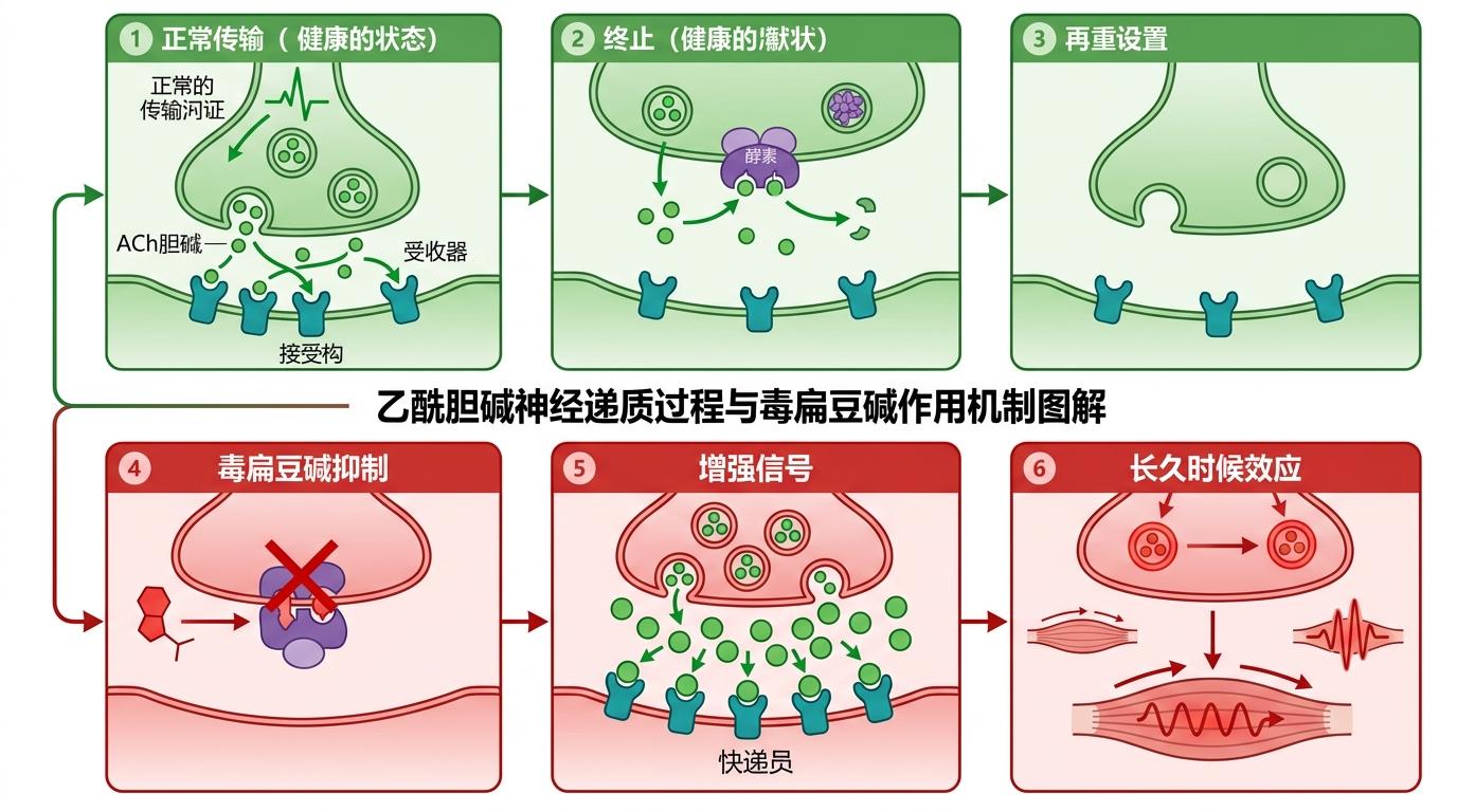 你可以把这个过程想象成:乙酰胆碱是神经传递的“快递员”,送完货就会被“快递站”(乙酰胆碱酯酶)回收销毁;而毒扁豆碱就是把快递站锁起来的钥匙,让快递员能在突触间隙里多待一会儿,反复传递信号。