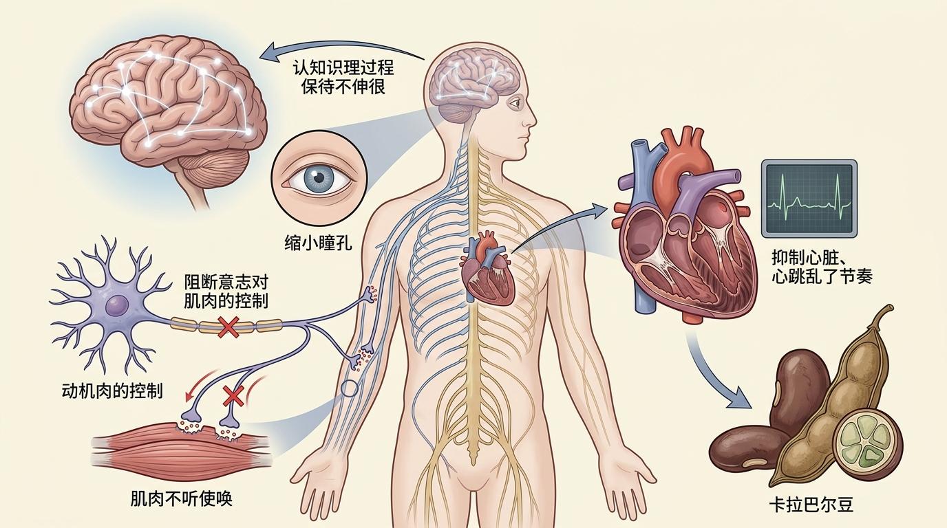 1855年的爱丁堡实验室,毒理学教授罗伯特·克里斯蒂森吞下了1/4粒卡拉巴尔豆。15分钟后,他的大脑清醒如常,身体却彻底不听使唤——心跳乱了节奏,肌肉像被焊死在骨骼上。靠着灌下肥皂水催吐,他才捡回一条命。这次以身试毒,让人类第一次科学描述了毒扁豆碱的毒性:它能抑制心脏、缩小瞳孔,还能阻断意志对肌肉的控制。