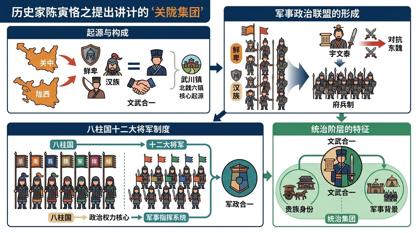 1942年,史学家陈寅恪提出「关陇集团」概念——这是一个以关中、陇西为基地,由鲜卑与汉族贵族混合组成的军事政治联盟,核心成员多来自北魏六镇中的武川镇。西魏权臣宇文泰为对抗东魏,推行府兵制改革,设立「八柱国十二大将军」制度,让成员兼具军政双重身份,形成「文武合一」的贵族阶层。