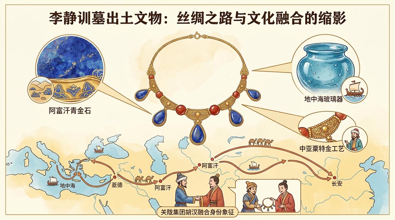更耐人寻味的是,李静训墓葬的奢华,也是关陇集团文化融合的缩影:陪葬品中的青金石来自阿富汗,玻璃器源自地中海,金项链的工艺带有中亚粟特风格,这些物品既是丝绸之路贸易的成果,也是关陇集团「胡汉融合」文化身份的象征——他们不只是军事贵族,更是跨文化交流的主导者。