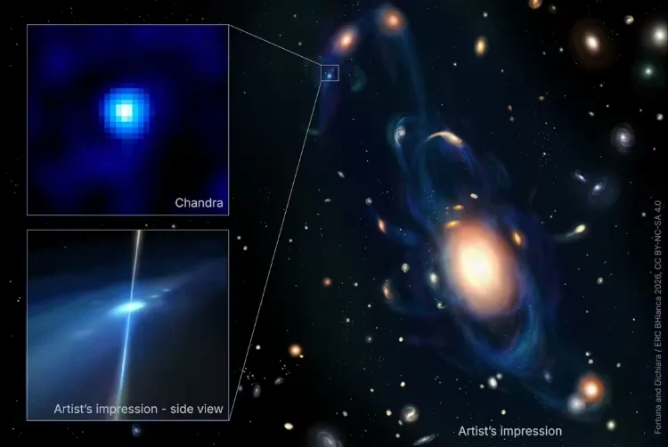 GRB 230906A的特殊之处,在于它把「中子星并合」的剧本往前倒推了一步。天文学家通过钱德拉X射线望远镜的亚角秒定位发现,它的宿主星系是个暗弱的小不点,嵌在一条180千秒长的潮汐尾巴里——这是两个大星系碰撞时,引力像扯橡皮筋一样从星系里拽出来的气体和恒星流。