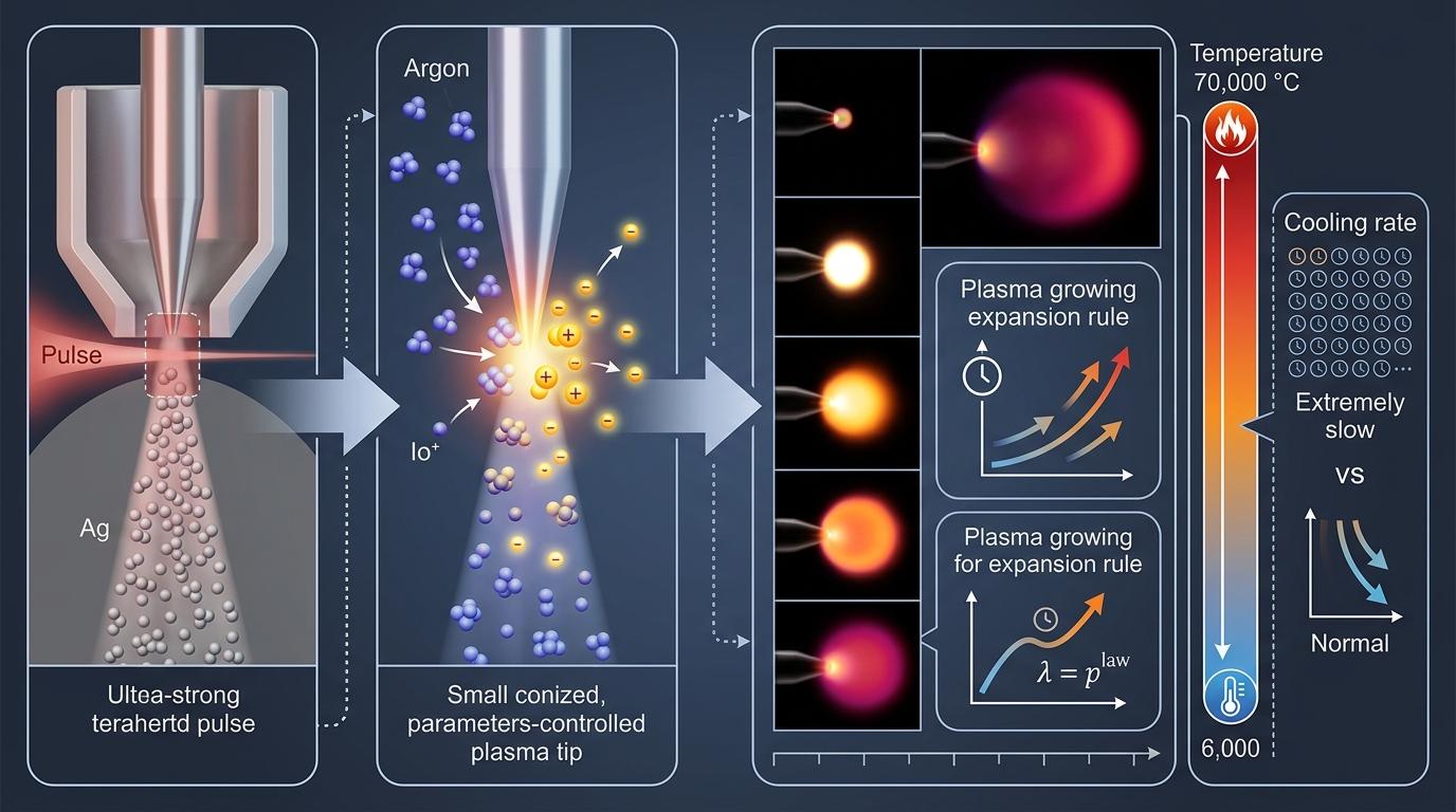 当这束超强太赫兹近场冲入高速氩气喷流的瞬间,氩气分子被瞬间电离,形成了参数精准可控的等离子体环境。高速成像系统捕捉到了全过程:一个直径约80微米的球状发光体从针尖处诞生,以R∝t^(2/5)的规律缓慢膨胀,电子温度从7万摄氏度缓缓降到6千摄氏度——这个冷却速度比普通等离子体慢了整整4到5个数量级。