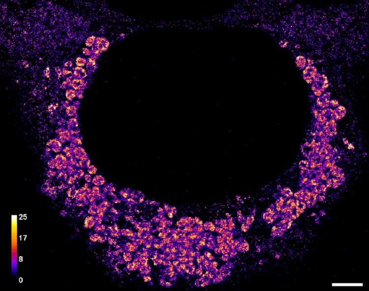 癌症免疫疗法的“鹰眼”:在针对血癌的CAR-T免疫疗法中,经过改造的免疫细胞需要识别癌细胞表面的CD19蛋白才能发起攻击。然而,在一些对疗法反应良好的多发性骨髓瘤患者身上,传统检测方法却“看”不到CD19。德国维尔茨堡大学的马库斯·萨奥尔(Markus Sauer)团队利用超分辨率显微镜,终于发现了真相:这些癌细胞表面确实存在CD19,只是数量极少。他们的研究证实,哪怕只有区区10个CD19蛋白,也足以被免疫疗法精准识别并摧毁癌细胞。这一发现,为更精准地筛选适合免疫疗法的患者提供了依据。