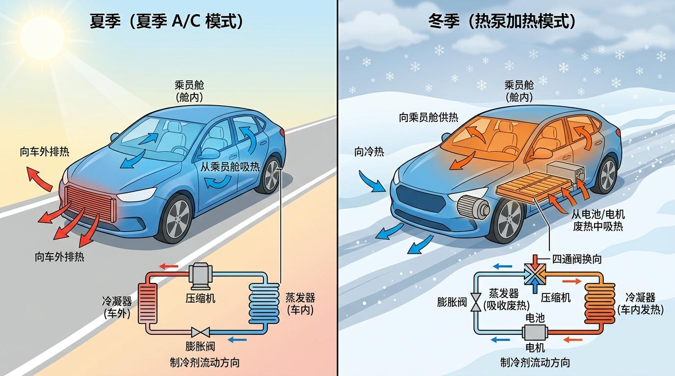 你可以把电动车的热泵空调,看成一台能在冬天“反向工作”的家用空调:家用空调夏天把室内热量排到室外,冬天则通过四通阀调转制冷剂方向,从室外吸热到室内;而电动车的热泵系统,不过是把“室外”换成了电池、电机工作时产生的废热,把“室内”换成了乘员舱和电池本身。