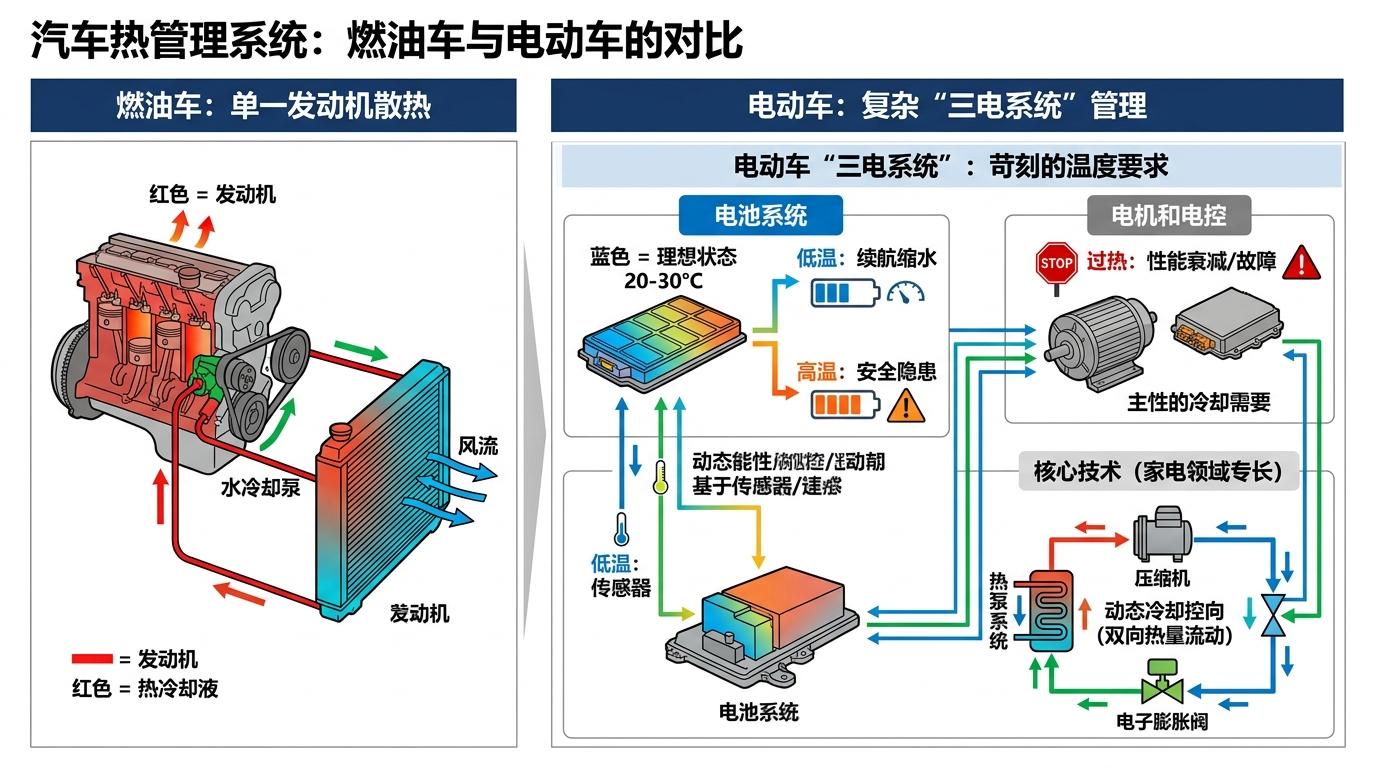 简单说,热管理就是给汽车的“心脏”和“大脑”做温度管家:燃油车只需要给发动机散热,技术门槛不高;但电动车的电池、电机、电控这“三电系统”,对温度的要求苛刻到了“差一度都不行”——电池温度低了续航缩水,高了容易出安全隐患,电机过热会直接罢工。而这套系统的核心技术,比如压缩机、电子膨胀阀、热泵循环,恰恰是家电企业做了几十年的看家本领。
