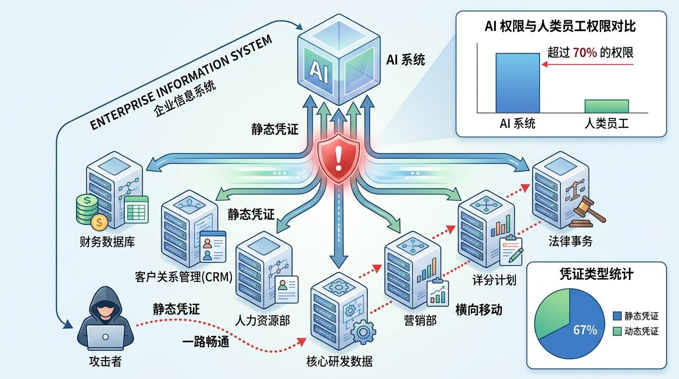 你可以把AI的权限想象成办公室的门禁卡:如果给实习生一张能打开所有房间的卡,风险可想而知。但现实中,70%的企业给AI的权限甚至超过了人类员工。67%的企业还在使用静态凭证,就像一张长期有效的万能门禁卡,一旦泄露或被滥用,攻击者能直接借助AI的合法权限在企业系统里横向移动,从财务数据到客户信息,一路畅通无阻。