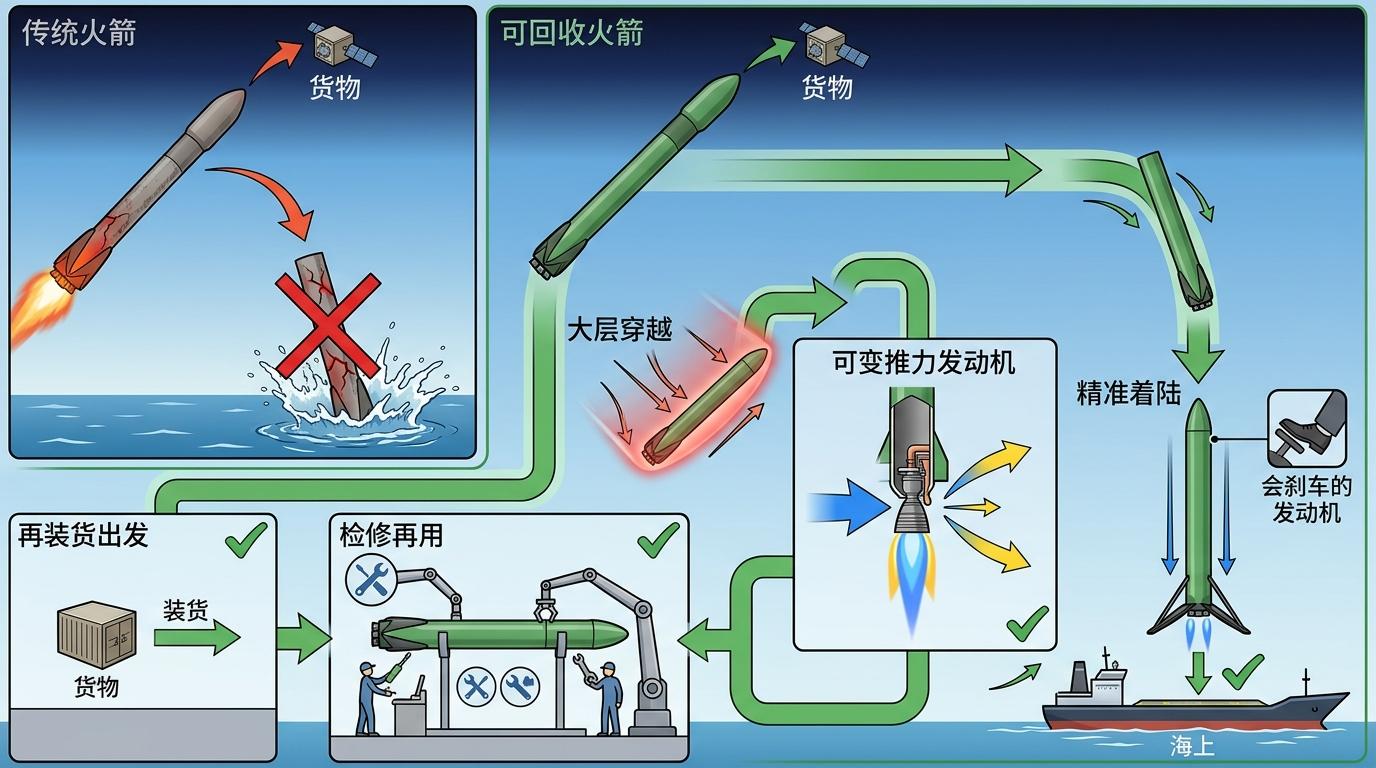 要理解可回收火箭的核心逻辑,不妨把它比作一辆能反复跑长途的卡车。传统火箭是把货物送到目的地后,连卡车一起扔掉;可回收火箭则是让卡车自己开回来,检修后再装货出发。区别在于,火箭返回时要穿越上千摄氏度的大气层,还要在没有跑道的地面或海上精准着陆,这就需要给它装上「会刹车的发动机」——该团队研发的可变推力发动机,能像踩油门一样精准调节动力,把着陆时的冲击力降到最低,就像卡车用缓速器平稳停在卸货区。