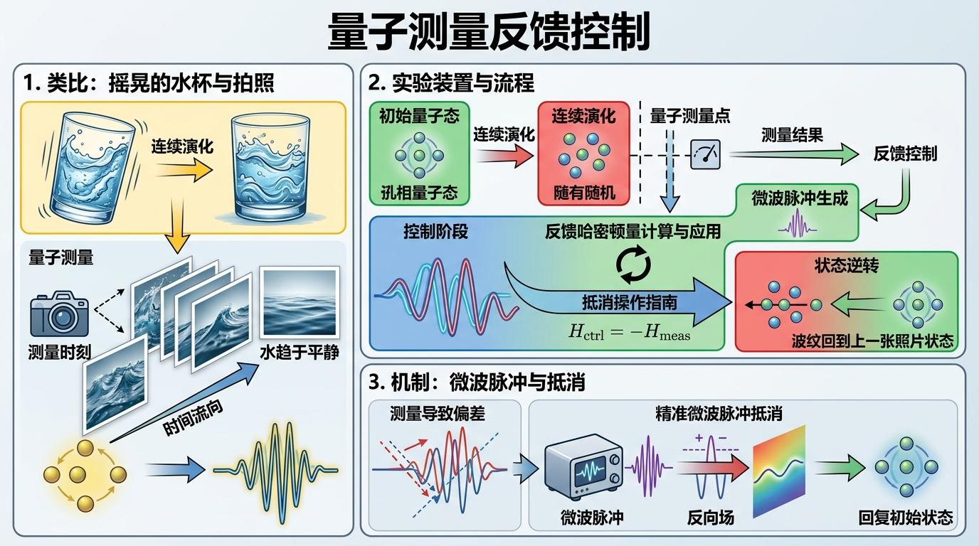 你可以把量子测量想象成给一杯摇晃的水拍照:每次按下快门,水就定格在某个波纹状态,而连续的照片连起来,就形成了「水越来越平静」的时间流向。洛斯阿拉莫斯的团队做的,就是在按下快门的瞬间,用精准的微波脉冲「晃」一下杯子,让水的波纹回到上一张照片的状态。他们设计了一套反馈哈密顿量——可以理解为一套精准的「抵消操作指南」,测量让系统往哪个方向偏,就用反向的场和脉冲把它拉回来。