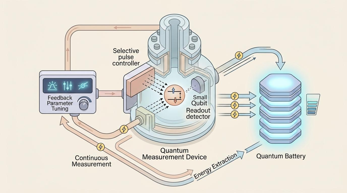 研究团队设计的这套机制,本质上是一个「测量发动机」:它不依赖传统的热源,而是把量子测量本身当作热力学资源。通过调节反馈参数,他们甚至能让这个发动机持续运转——只要不断测量,就能不断从测量过程中提取能量,为量子电池充电。
