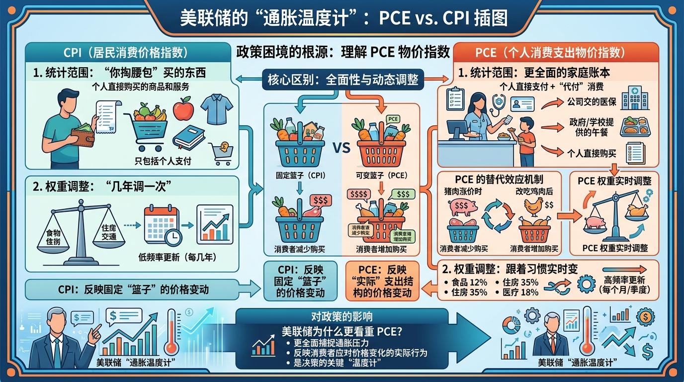 要理解当前的政策困境,得先搞懂美联储的“专属通胀温度计”——个人消费支出物价指数(PCE)。你可以把它想象成比CPI更全面的家庭账本:CPI只算你自己掏腰包买的东西,而PCE还包括公司帮你交的医保、学校给孩子的午餐这类“代付消费”;CPI的权重几年才调一次,PCE却会跟着你买东西的习惯实时变——比如猪肉涨价你改吃鸡肉,PCE的权重就会立刻反映这种替代。