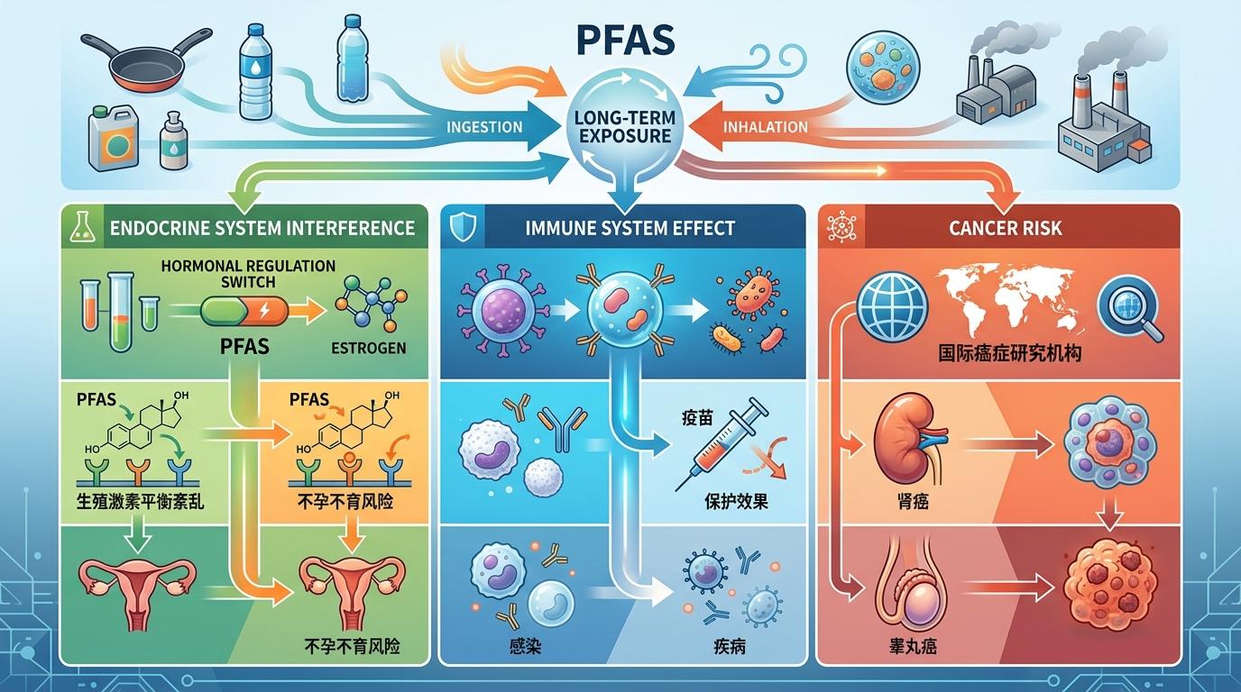 科学研究已经明确,长期接触PFAS会干扰人体的内分泌系统,就像把调节激素的开关拨乱——它会模仿雌激素的作用,打乱生殖激素的平衡,增加不孕不育的风险;还会影响免疫系统,让疫苗的保护效果打折扣。更让人警惕的是,国际癌症研究机构已将部分PFAS列为人类致癌物,它和肾癌、睾丸癌的关联,在职业暴露人群的研究中得到了反复印证。