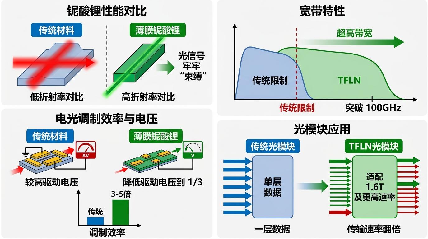 但真实的机制比这更精确:薄膜铌酸锂的折射率对比度比传统材料高10倍以上,能把光信号牢牢“束缚”在纳米级波导中,电光调制效率提升了3-5倍,驱动电压却降到了传统材料的1/3。更关键的是,它的带宽能轻松突破100GHz,完美适配1.6T及更高速率光模块的需求——这意味着同样大小的光模块,传输速率能翻一倍。