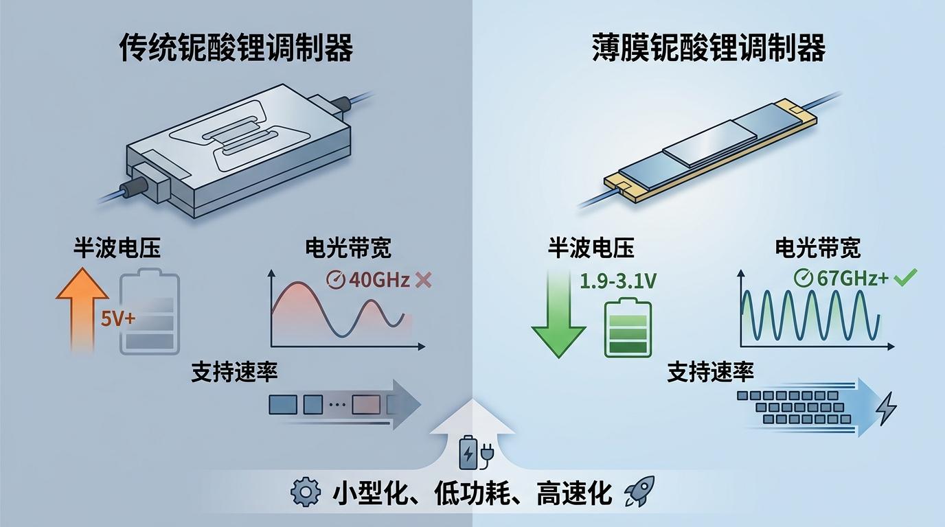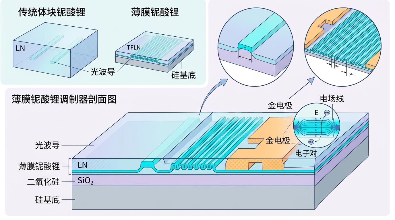 你可以把光模块想象成数据传输的“高速收费站”,而调制器就是负责把电信号转换成光信号的“收费亭”——它的效率直接决定了整条线路的通行速度。过去,传统铌酸锂材料就像用水泥砌成的宽车道,虽然稳定,但车道间距大,车辆(光信号)跑不快;而薄膜铌酸锂,则是在硅片基底上“铺”了一层几十纳米厚的铌酸锂薄膜,相当于把车道压缩到了极致,让光信号能以更高密度、更快速度通过。