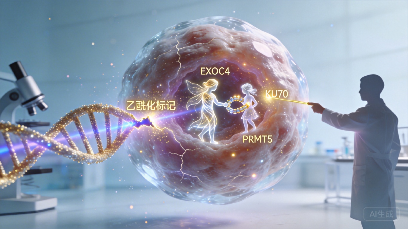 进入细胞核的EXOC4,立刻变成了DNA修复系统的“调度员”。它会主动牵线,让蛋白精氨酸甲基转移酶PRMT5和DNA修复核心蛋白KU70凑到一起。PRMT5就像个“刻章师傅”,会在KU70的第318位精氨酸上刻一个甲基化标记。