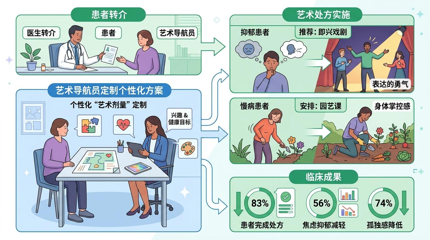 美国马萨诸塞州的 Art Pharmacy 项目已经跑通了模式:医生把患者转介给「艺术导航员」,后者会根据患者的兴趣和健康目标,定制个性化的「艺术剂量」——比如给抑郁患者推荐即兴戏剧,帮他们重新找回表达的勇气;给慢病患者安排园艺课,在动手的过程中重建对身体的掌控感。数据显示,83%的患者完成了处方,56%的人焦虑抑郁症状减轻,74%的人孤独感明显降低。