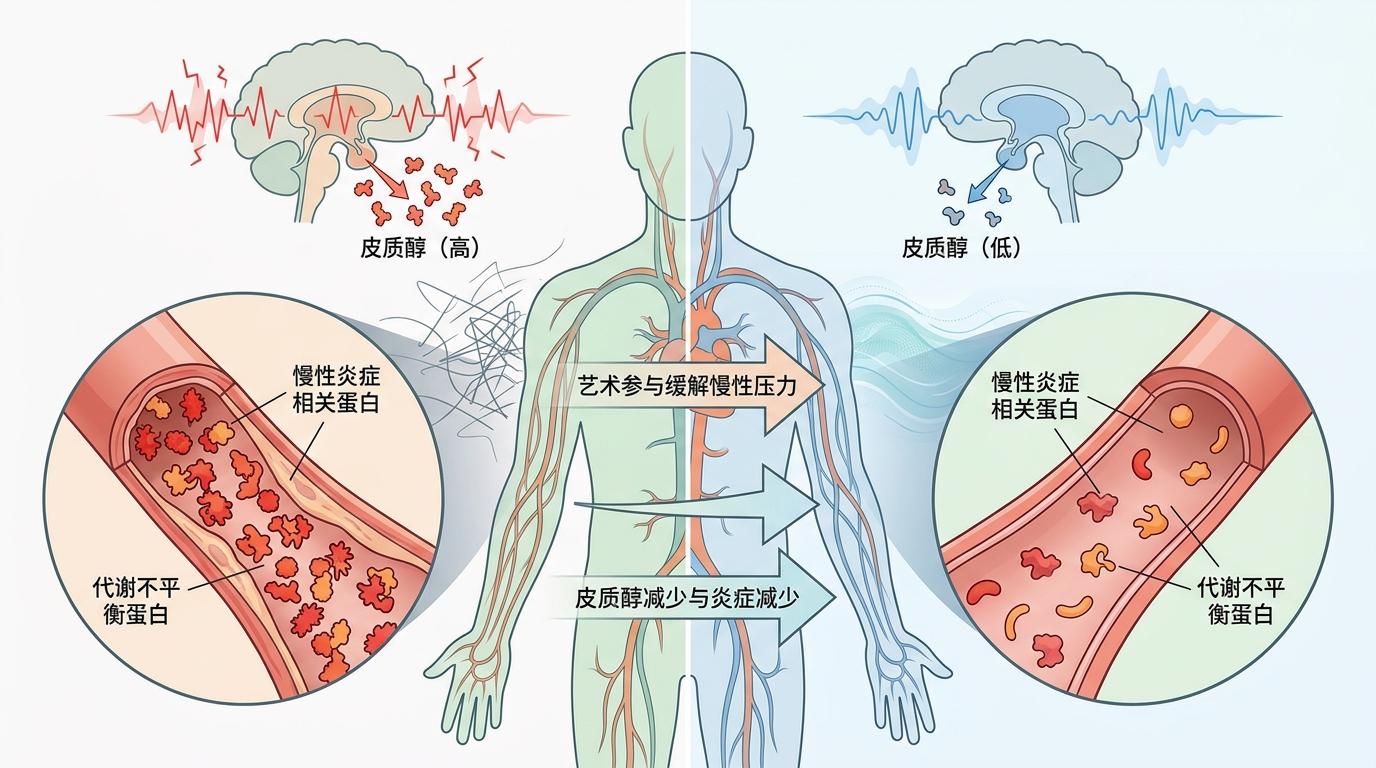 最核心的生理层面,艺术正在悄悄改写你的身体指标。英国一项针对6000人的蛋白质组研究发现,艺术参与者的血清中,和炎症、代谢相关的蛋白质水平明显更低——慢性炎症是糖尿病、心血管病的共同土壤,而艺术能通过降低皮质醇水平,缓解慢性压力带来的炎症反应。就像给持续紧绷的身体松了绑,让免疫和代谢系统重新回到正轨。