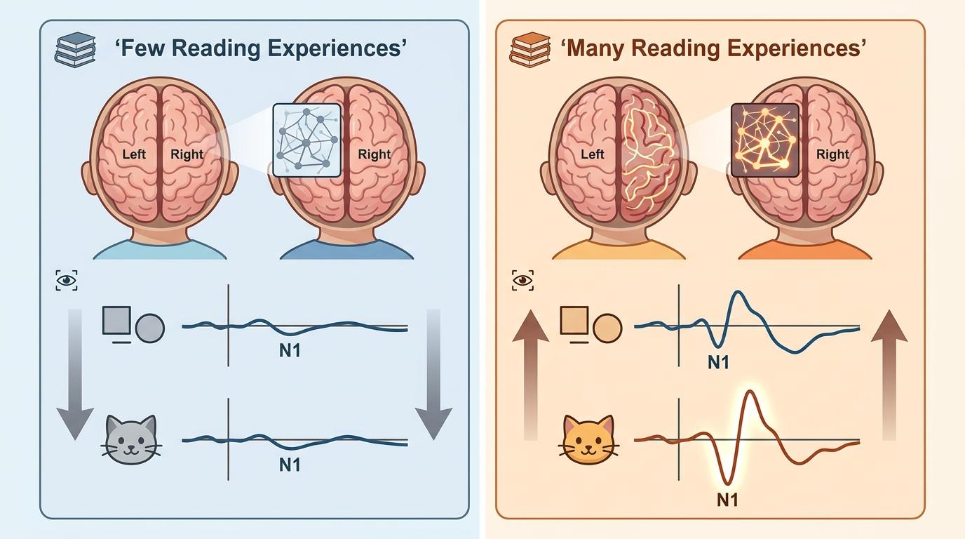 如果把孩子的阅读能力比作一棵树,环境是土壤,那么大脑里的神经活动就是树干的年轮——能清晰看出成长的痕迹。神经科学家发现了一个关键的“年轮”:N1效应。 简单说,当你看到文字时,大脑枕颞叶(大概在眼镜末端的位置)会在140-200毫秒内产生一个负波,这就是N1。成熟阅读者的N1对文字特别敏感,波幅比看其他视觉刺激大很多,而且只出现在左脑——这是大脑为阅读专门进化出的“快速通道”。 但孩子的大脑不是天生就有这个通道。研究显示,幼儿园里没读过书的孩子,看文字和看无意义符号的N1波幅几乎重合;经过1.5年的阅读学习,小学二年级孩子的N1波幅会突然增强,和符号的波幅彻底分开。更重要的是,5-6岁的孩子里,阅读经验多的孩子,左脑对文字的N1反应明显强于对卡通面孔的反应;而阅读经验少的孩子,两者的波幅几乎没差别。