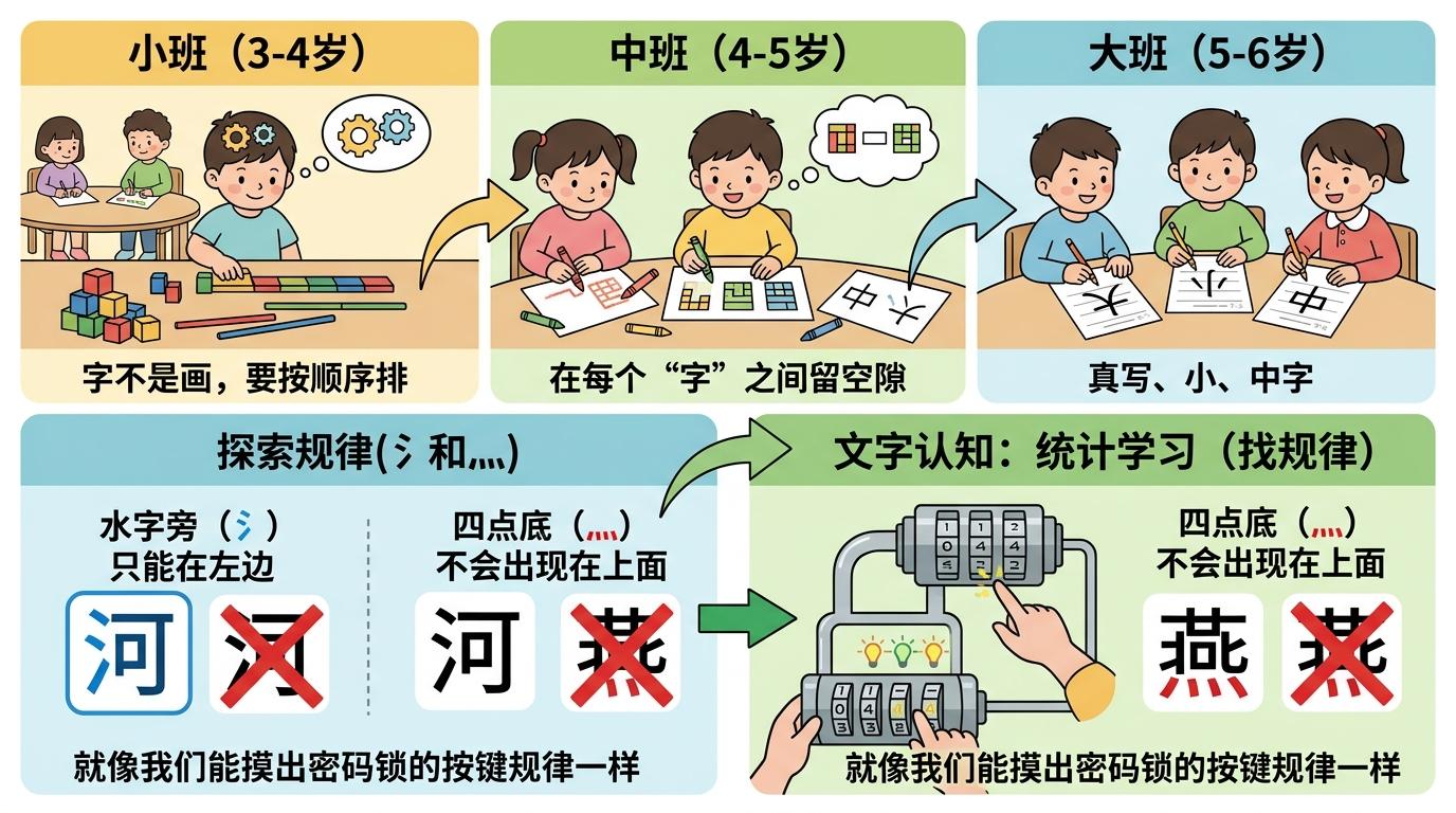 你可能没听过“读写萌发期”这个词,但你一定见过孩子的这些行为:盯着超市的肯德基logo喊“炸鸡”,拿着绘本假装“读”故事,甚至在纸上模仿大人写字——这些都是3-6岁孩子的“阅读练习”。 这个阶段的孩子不需要学认生字,他们在做更重要的事:建立对文字的认知。比如3-4岁的小班孩子,会把线条排成行,知道“字不是画,要按顺序排”;到了中班,他们能画出类似汉字的方块,还会在每个“字”之间留空隙;大班孩子已经能写出简单的常用字。他们还会通过“统计学习”悄悄找规律:比如知道“氵”只会在字的左边,“灬”不会出现在字的上面,就像我们能摸出密码锁的按键规律一样。