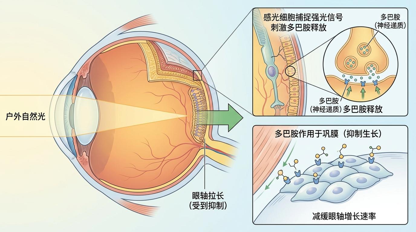 多巴胺就是那个被低估的关键角色。视网膜上的感光细胞能捕捉户外强光的信号,刺激多巴胺释放——这种神经递质会像刹车一样,牢牢按住眼轴增长的速度。室内照明的强度通常只有几百勒克斯,而户外自然光能达到10万勒克斯,是前者的几百倍。这也是为什么每天2小时户外活动,会被全球眼科研究一致认定为最有效的近视预防手段:它不是让孩子去看绿树,是让眼睛泡在足量的自然光里,给多巴胺的分泌“充够电”。