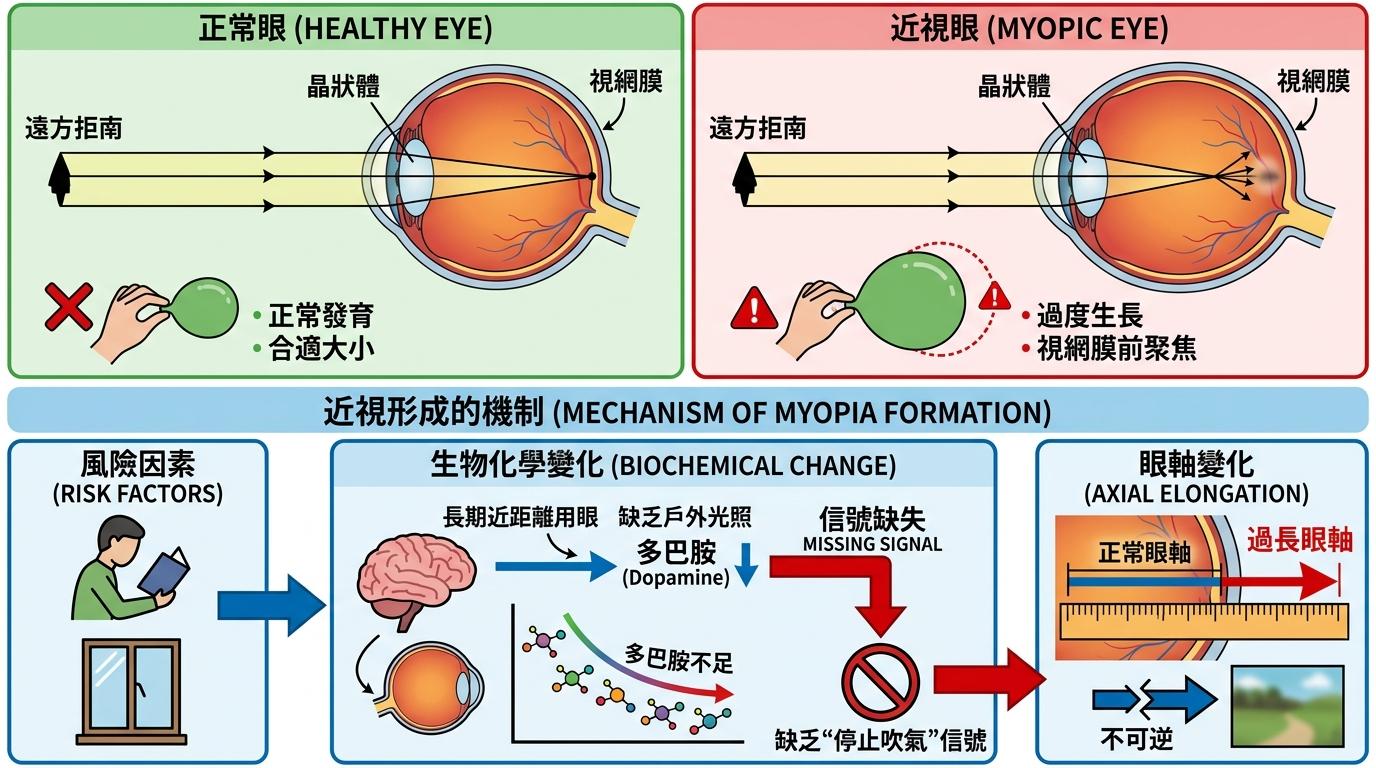 近视的本质,是眼球的前后轴(眼轴)悄悄变长了。原本该精准落在视网膜上的光线,因为眼轴过长,只能聚焦在视网膜前方,远处的世界自然就模糊了。这个过程像给气球吹气:正常发育的眼轴会慢慢“吹”到合适大小就停,但如果长期近距离用眼、缺乏户外光照,视网膜分泌的多巴胺不足,就像失去了“停止吹气”的信号,眼轴会一路疯长,最终变成不可逆转的近视。