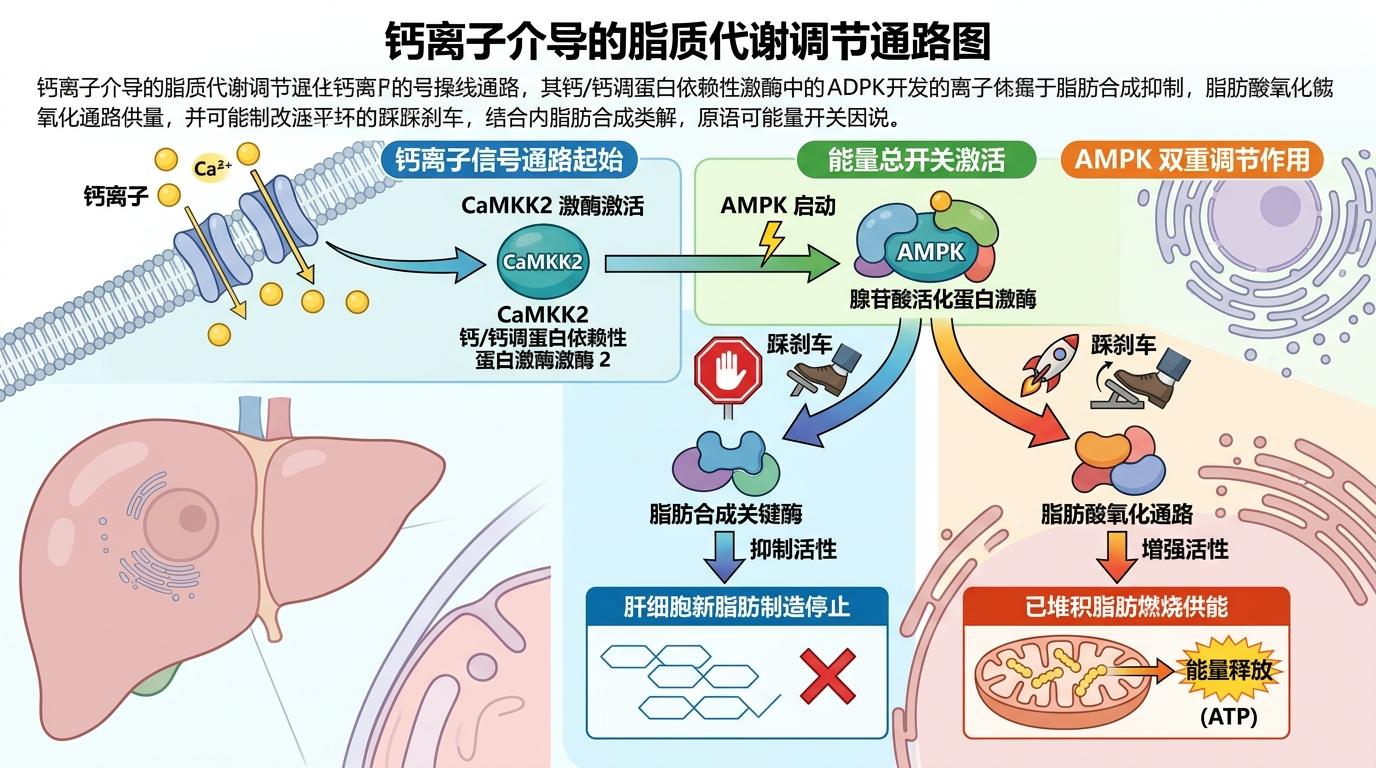 钙离子涌进来后,会激活一个叫CaMKK2的激酶,它就像信号传递的“传令兵”,紧接着激活细胞里的能量总开关AMPK。AMPK一启动,就会同时干两件事:一边给脂肪合成的关键酶“踩刹车”,让肝细胞不再疯狂制造新脂肪;一边给脂肪酸氧化的通路“踩油门”,把已经堆积的脂肪烧掉供能。